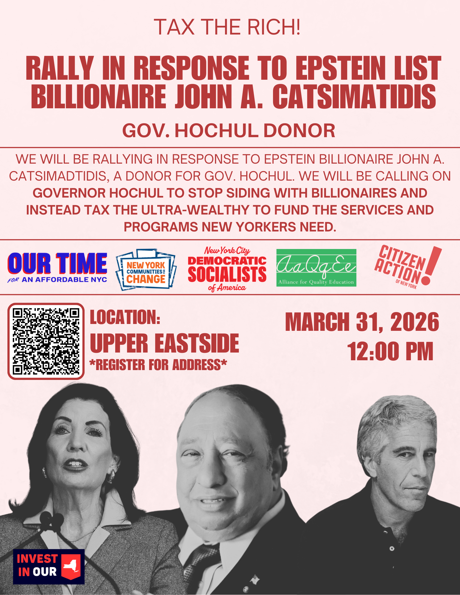 Join us on March 31 at 12:00 PM for a rally calling on Governor Hochul to stop protecting billionaire Epstein donors like John A. Catsimatidis and start standing with everyday New Yorkers. While working families struggle with rising costs, billionaire donors continue to have outsized influence over our politics and tax policies. It’s time to tax the ultra-wealthy and make New York work for everyone.