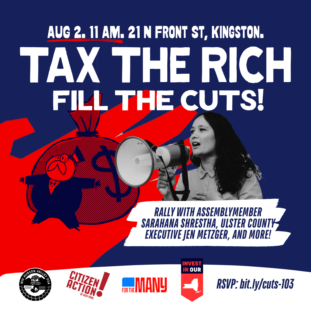 For all these reasons, we are calling for a special session in Albany to TAX THE RICH & FILL THE CUTS, and pass state legislation to counter the Trump administration's unprecedented funding of ICE by protecting immigrants at the local level. Rally with Assemblymember Sarahana Shrestha, Ulster County Executive Jen Metzger, and more this Saturday, at 11 AM in Kingston.