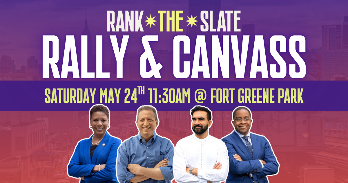 Join us for our #RankTheSlate rally and canvass! You will meet the slate - Adrienne Adams, Brad Lander, Zellnor Myrie, and Zohran Mamdani - and hear why THEY are the candidates fighting for working families. We know how critical this election is, so after the kick-off rally, we will do a quick training and dispatch volunteers to knock doors across Brooklyn. We'll encourage voters to RANK THE SLATE!