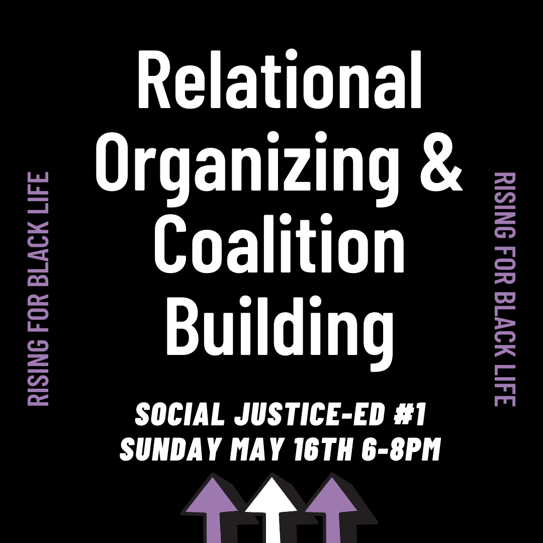 Social Justice Education #1- Let's Go! Join us Sunday May 16th for a participatory learning experience where we will dive into relational organizing & coalition building. What the heck is relational organizing & coalition building?! WE GOT YOU! The first hour we will run through the tenants of both practices, then we will spend the second hour building relationships, getting to know each other and diving even deeper into the topics. Be ready with a snack or a glass of wine because we are about to have a good ole time.