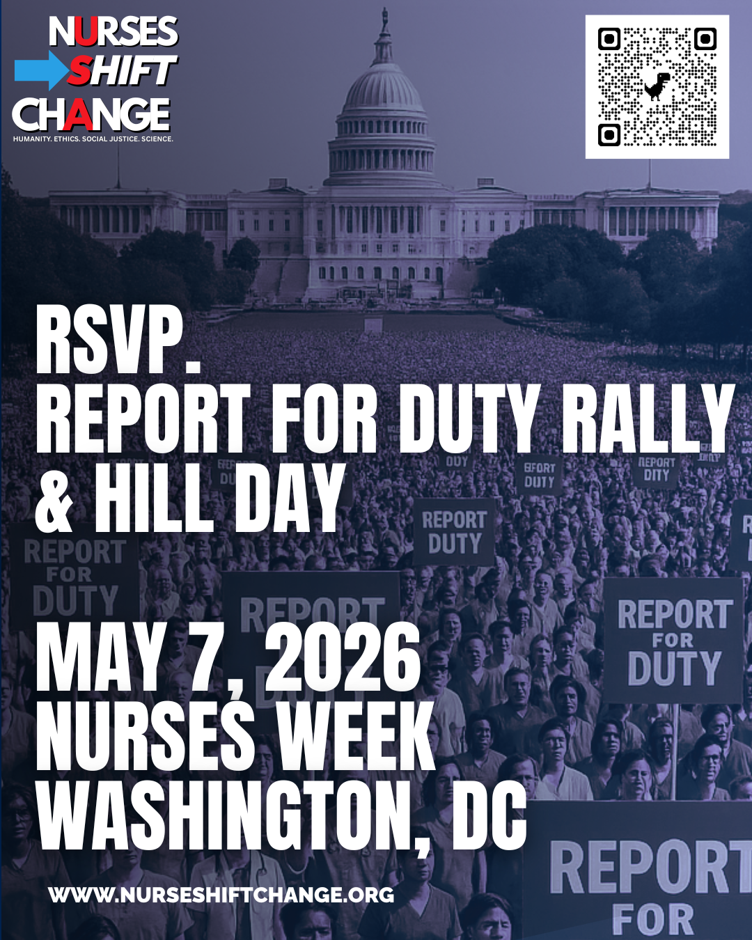 The Report for Duty Rally is a national day of action bringing together nurses, healthcare workers, and allies for collective presence, public demonstration, and direct policy engagement. The day will include a community gathering, a midday rally, and afternoon advocacy visits on Capitol Hill.