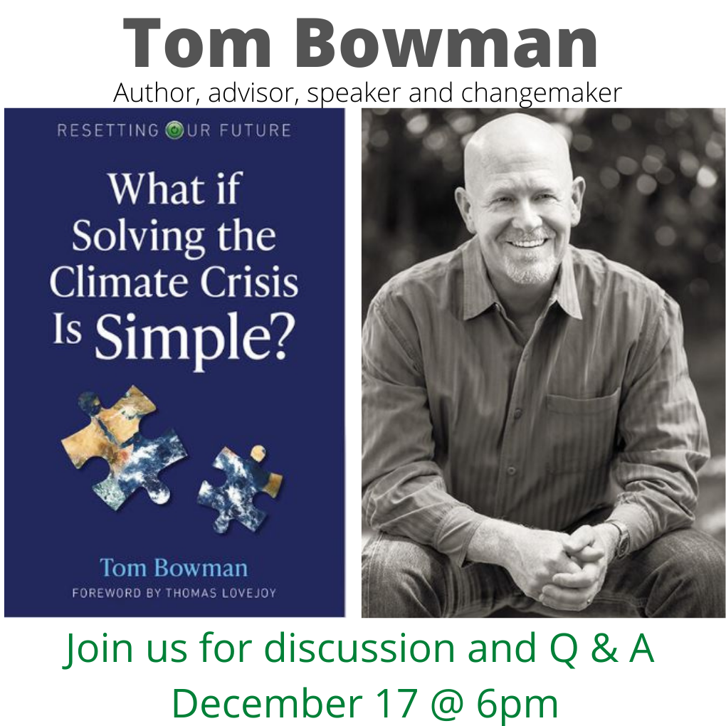 Join us for NAZCCA Book Club! This is a great way for our community to connect and for you to invite new people to join us! We plan to select books that represent our biggest global climate challenges. The challenge to you is to invite someone new. It is so important that we expand our outreach and introduce new people to NAZCCA. As part of the solution we can educate and connect people with local climate action and groups. Tom Bowman will be joining us on zoom to tell his story and the background behind his writing this book.
