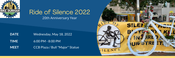 Join Bike Durham and friends for a slow, silent bike ride around downtown to honor and remember those killed or injured while biking. All are welcome and encouraged to ride with us to show solidarity for the community of bikers and walkers who have lost their lives and whose families are forever changed. This ride occurs internationally on the third Wednesday in May.