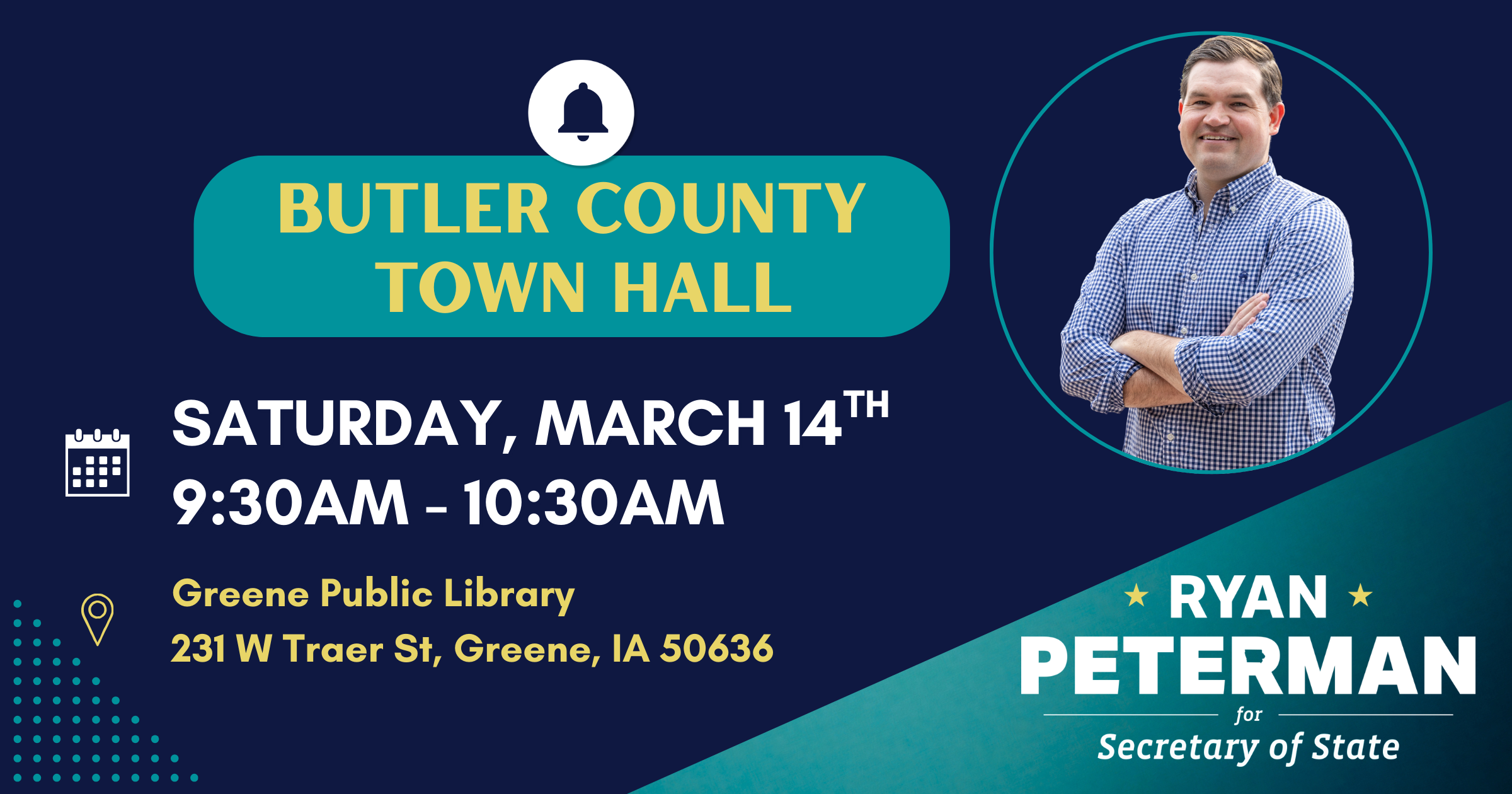 Ryan will be at the Greene Public Library on Saturday, March 14th at 9:30am. Come hear about Ryan's vision for Iowa, ask him questions, and if you aren't registered to vote, we will have voter registration forms too!