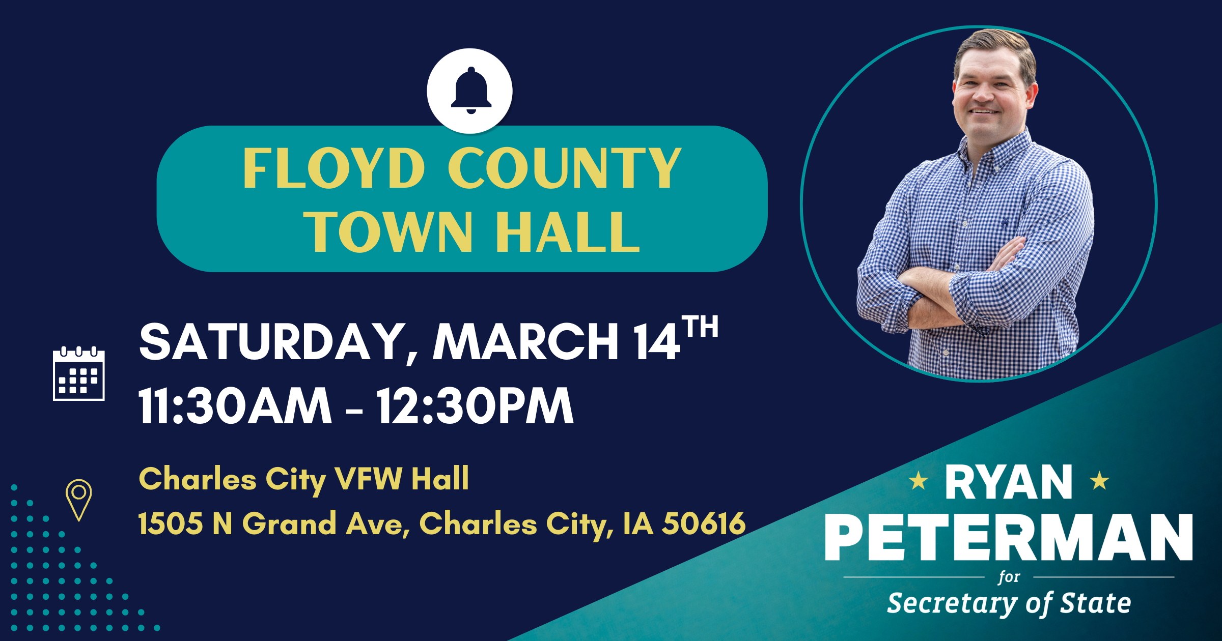 Ryan will be at the Charles City VFW Hall on Saturday, March 14th at 11:30am. Come hear about Ryan's vision for Iowa, ask him questions, and if you aren't registered to vote, we will have voter registration forms too!