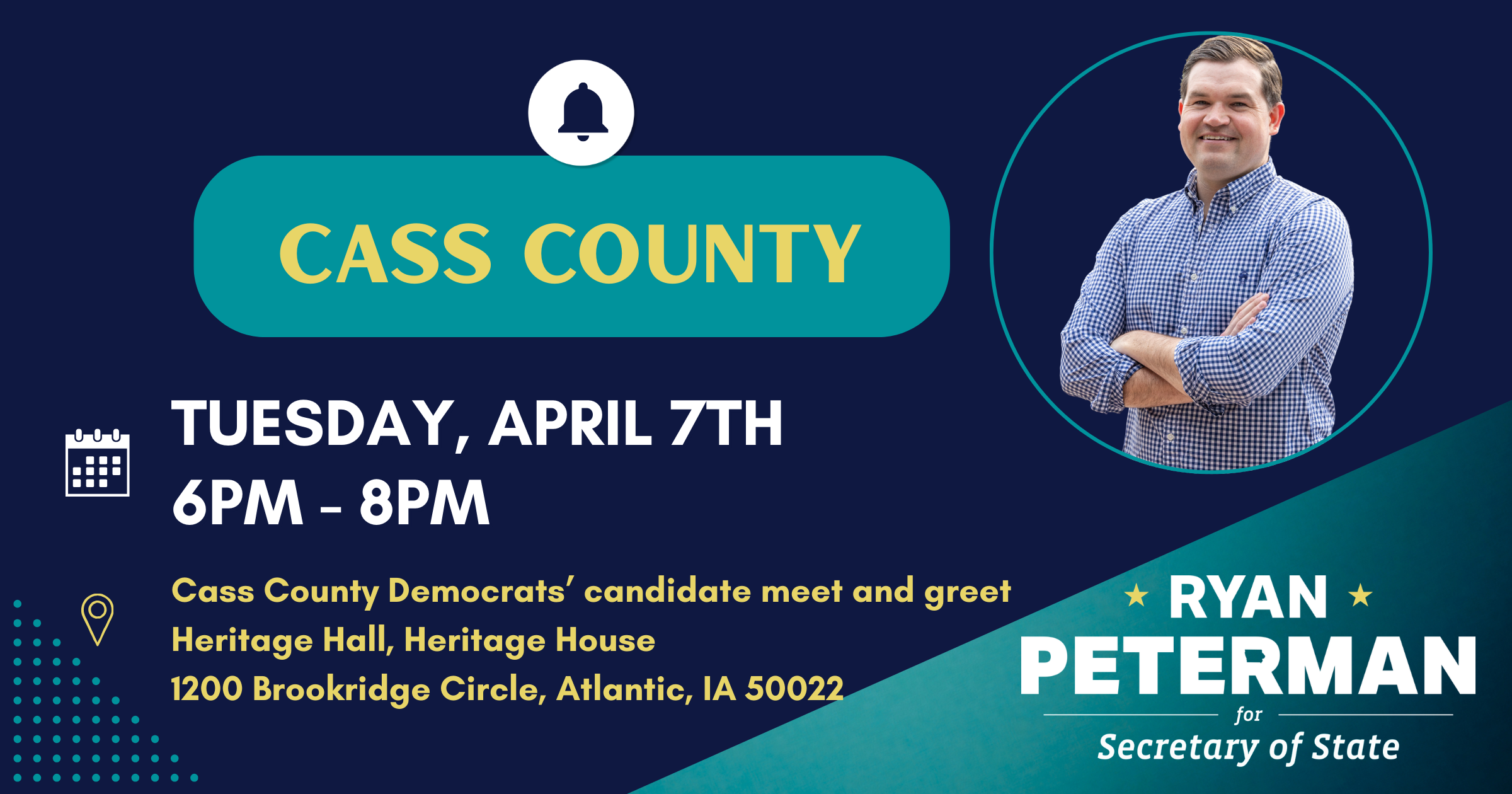 Come meet Iowa Secretary of State candidate Ryan Peterman in Atlantic as part of the Cass County Democrats' candidate meet and greet event!