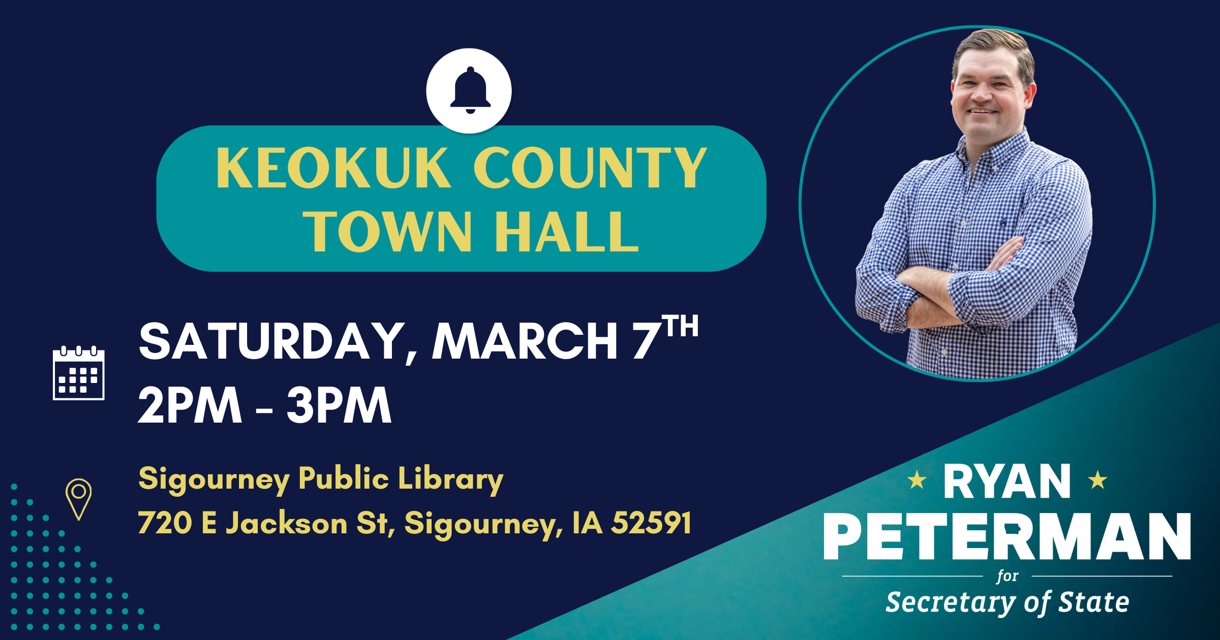 Come meet Iowa Secretary of State candidate Ryan Peterman in Sigourney as part of his town hall tour! Ryan is a former Navy helicopter pilot running for Secretary of State to protect our right to vote, strengthen our small businesses, and restore honor and integrity to the office.
