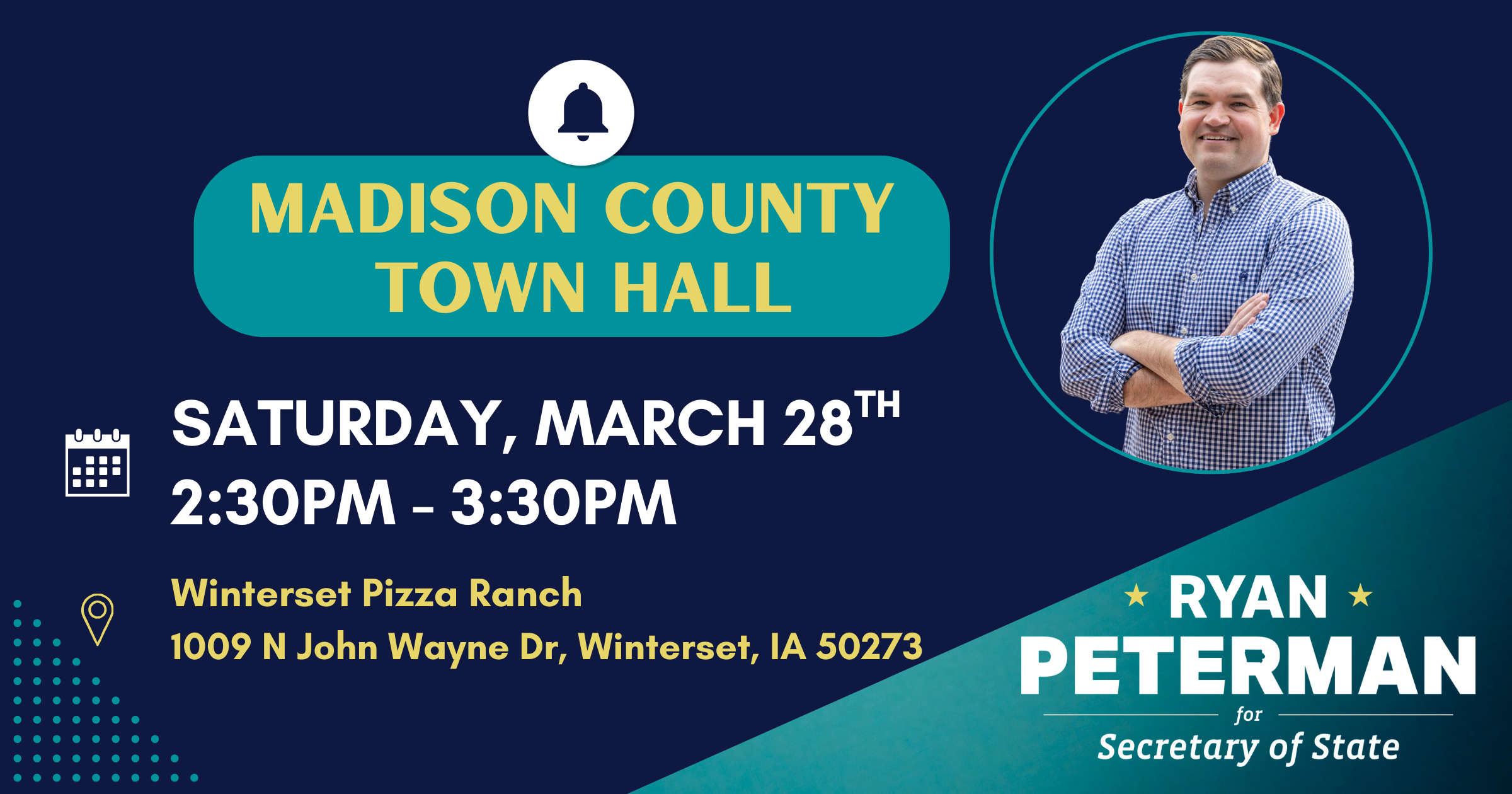 Come meet Iowa Secretary of State candidate Ryan Peterman in Winterset as part of his town hall tour! Ryan is a former Navy helicopter pilot running for Secretary of State to protect our right to vote, strengthen our small businesses, and restore honor and integrity to the office.