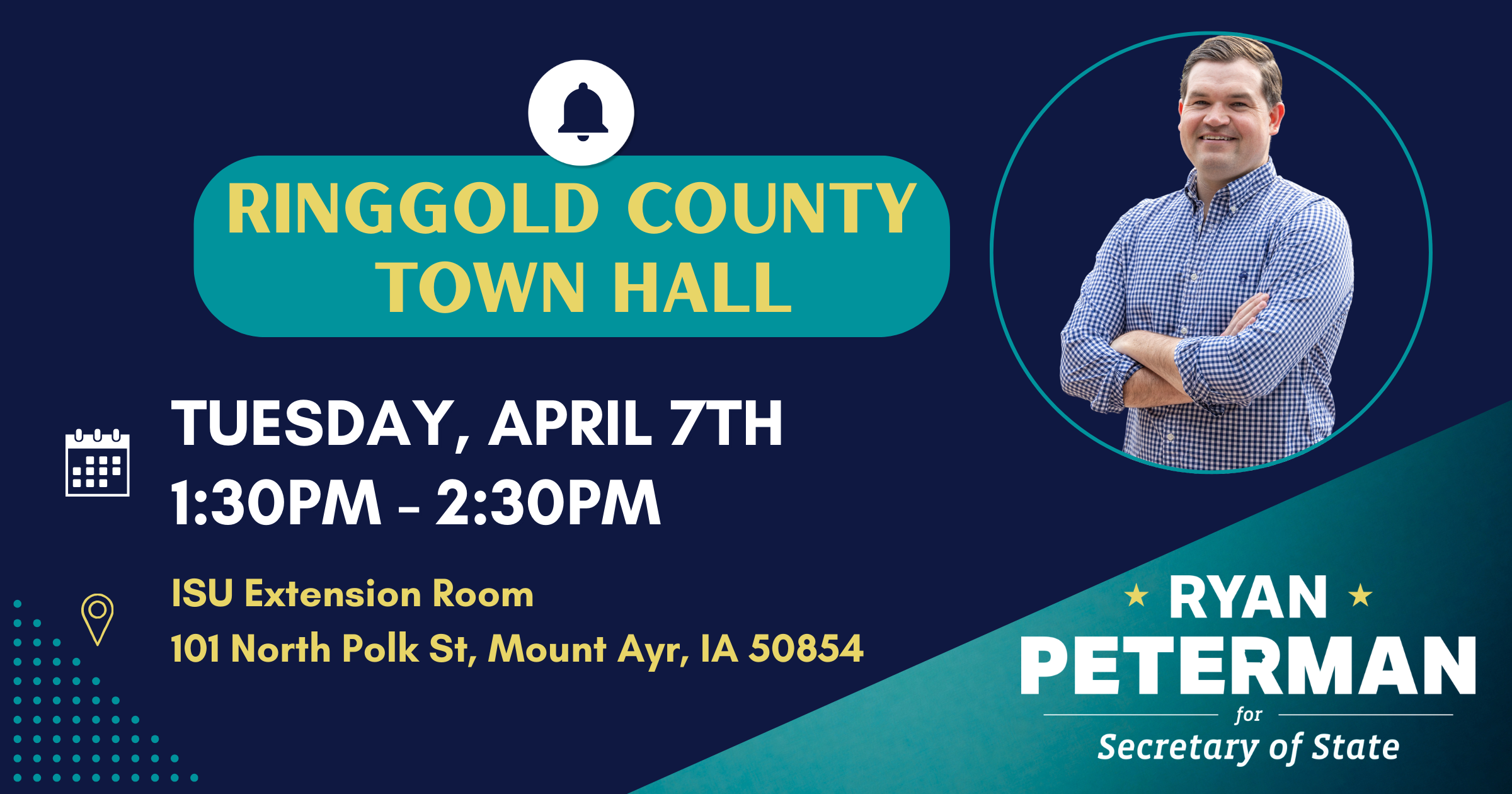 Come meet Iowa Secretary of State candidate Ryan Peterman in Mount Ayr as part of his town hall tour! Ryan is a former Navy helicopter pilot running for Secretary of State to protect our right to vote, strengthen our small businesses, and restore honor and integrity to the office.