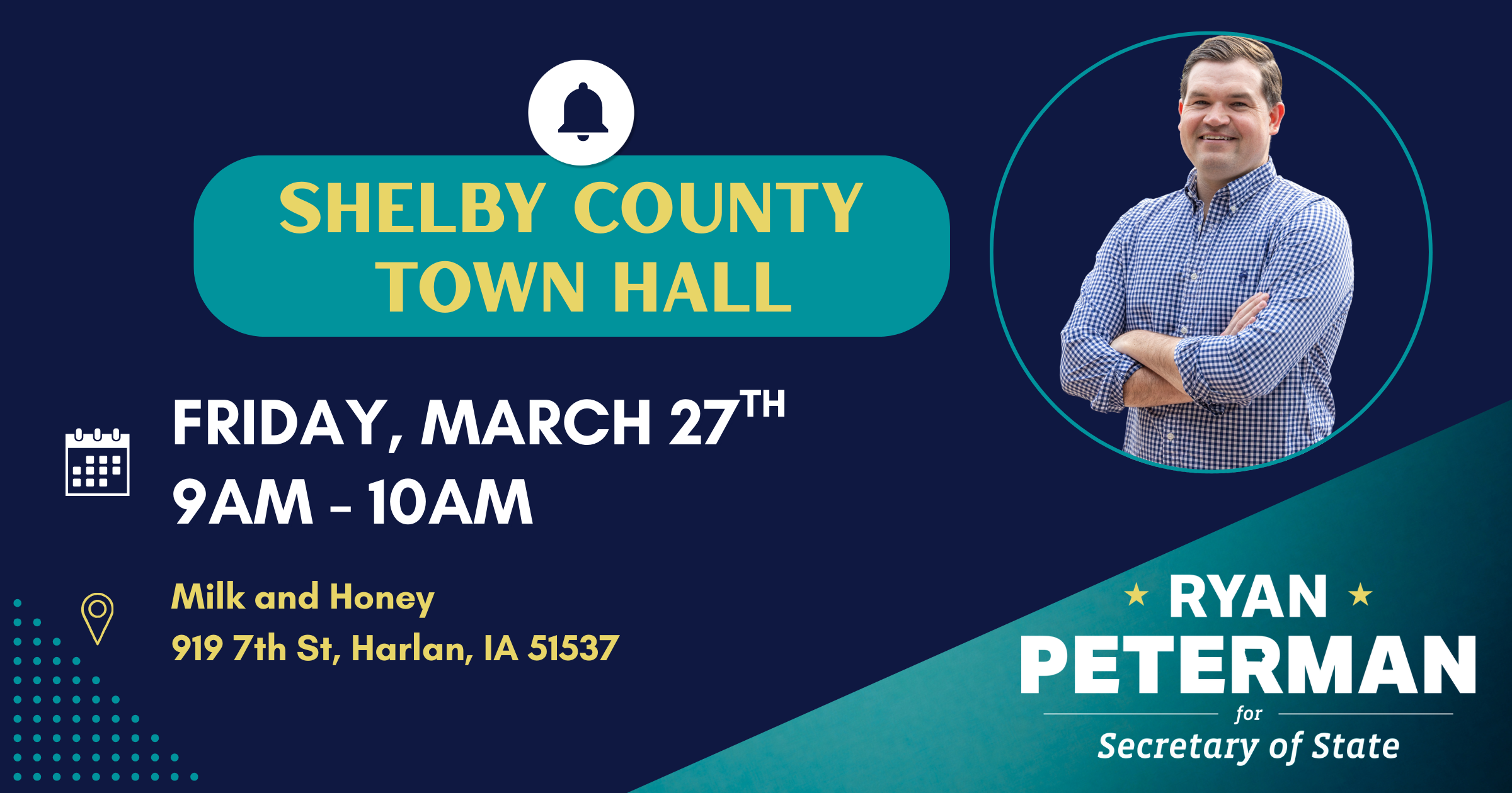 Come meet Iowa Secretary of State candidate Ryan Peterman in Harlan as part of his town hall tour! Ryan is a former Navy helicopter pilot running for Secretary of State to protect our right to vote, strengthen our small businesses, and restore honor and integrity to the office.