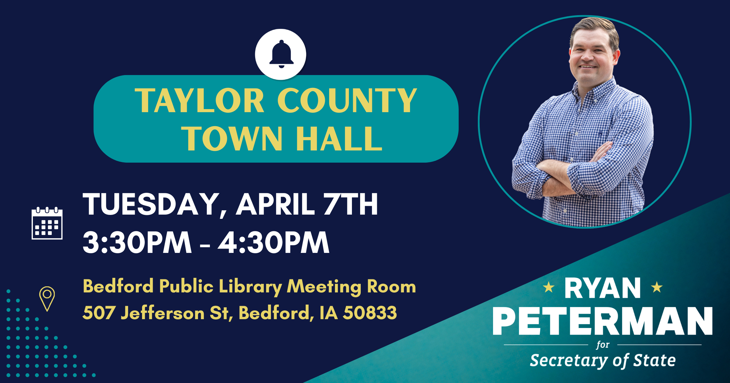 Come meet Iowa Secretary of State candidate Ryan Peterman in Bedford as part of his town hall tour! Ryan is a former Navy helicopter pilot running for Secretary of State to protect our right to vote, strengthen our small businesses, and restore honor and integrity to the office.