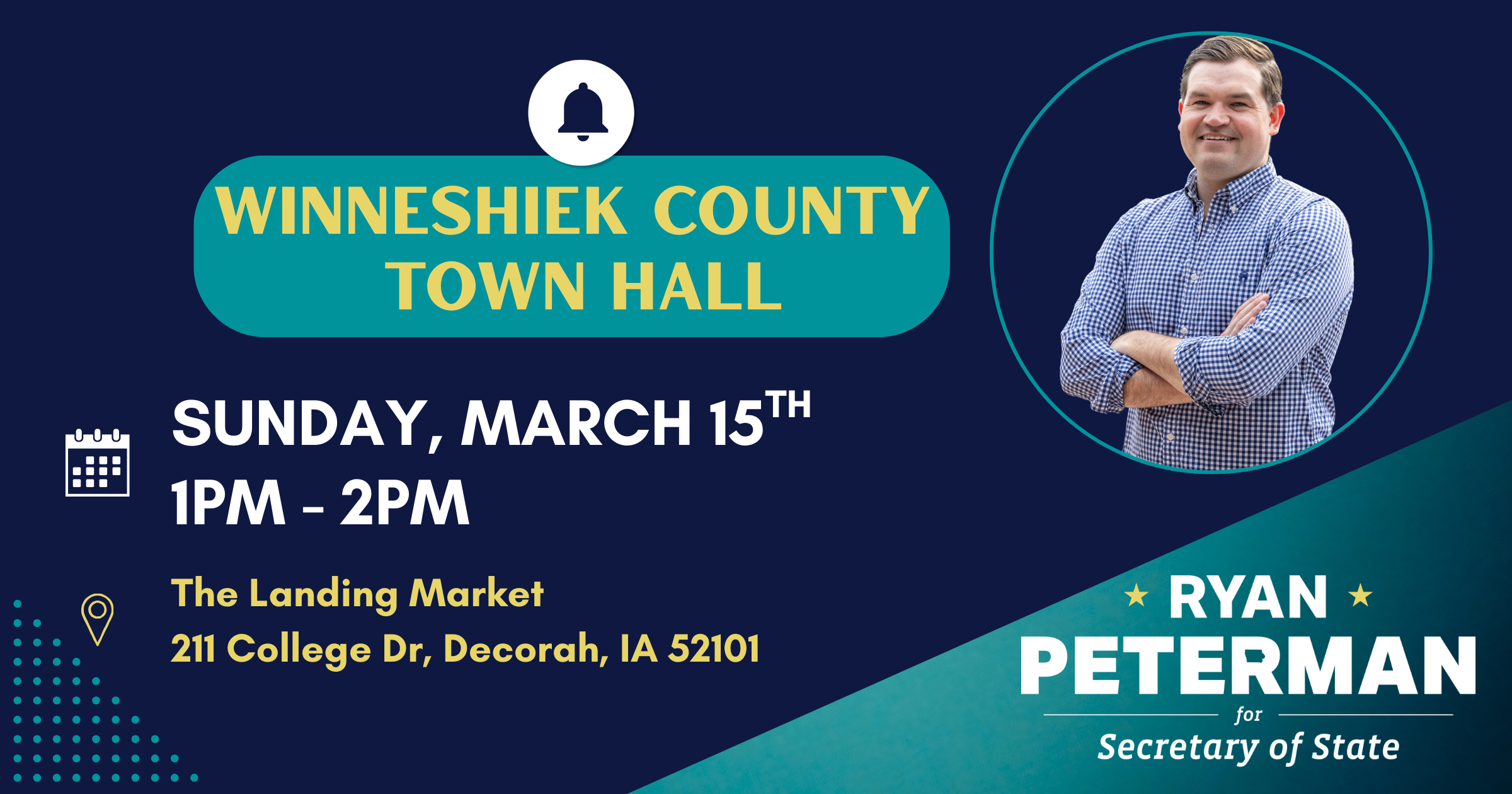 Ryan will be at The Landing Market in Decorah on Sunday, March 15th at 1pm. Come hear about Ryan's vision for Iowa, ask him questions, and if you aren't registered to vote, we will have voter registration forms too!