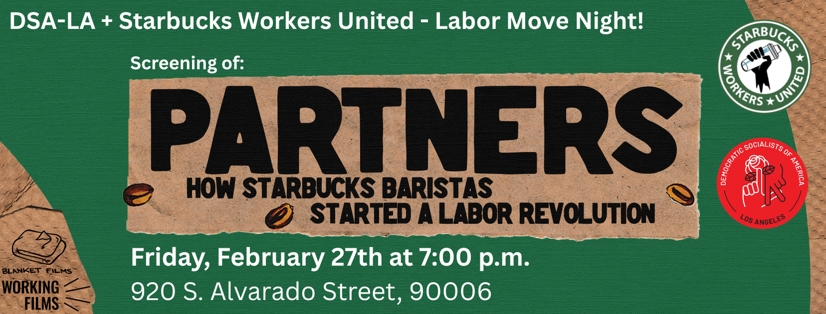DSA-LA and Starbucks Workers United are hosting a movie night on Friday, February 27th, at 7pm!