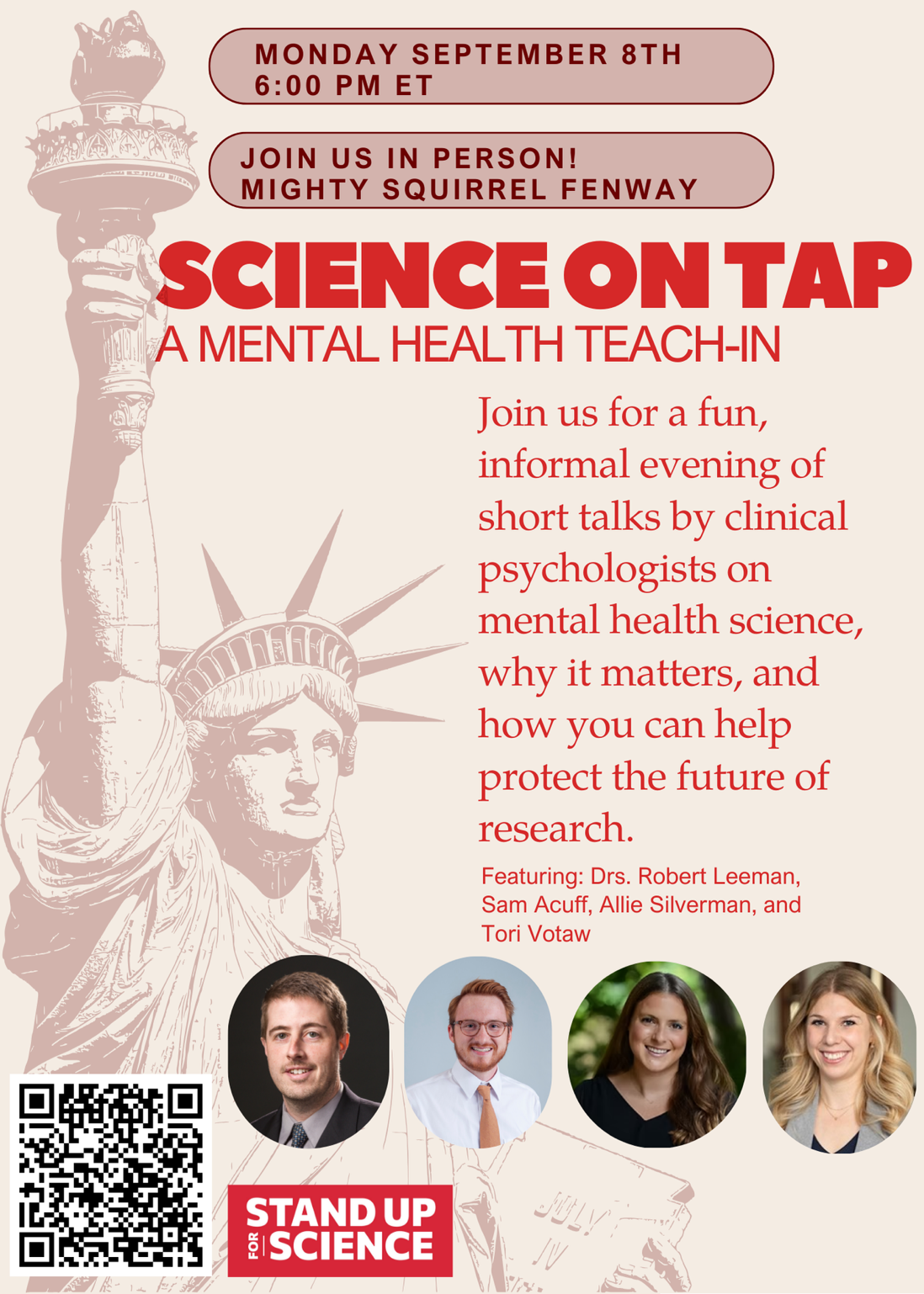 Join the Massachusetts chapter of Stand Up for Science for a lively Teach-In at Mighty Squirrel Fenway on Monday, September 8 from 6-8 pm. Listen to quick, fun talks from 4 local clinical psychologists on: