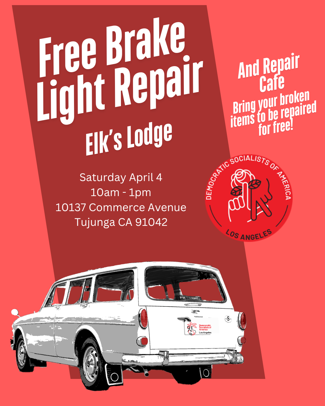 If you’d like to volunteer for brake light repair or help with the repair cafe, please check the DSA-LA calendar for Mutual Aid’s next Zoom meeting (every 2nd and 4th Monday) or email us at mutualaid@dsa-la.org