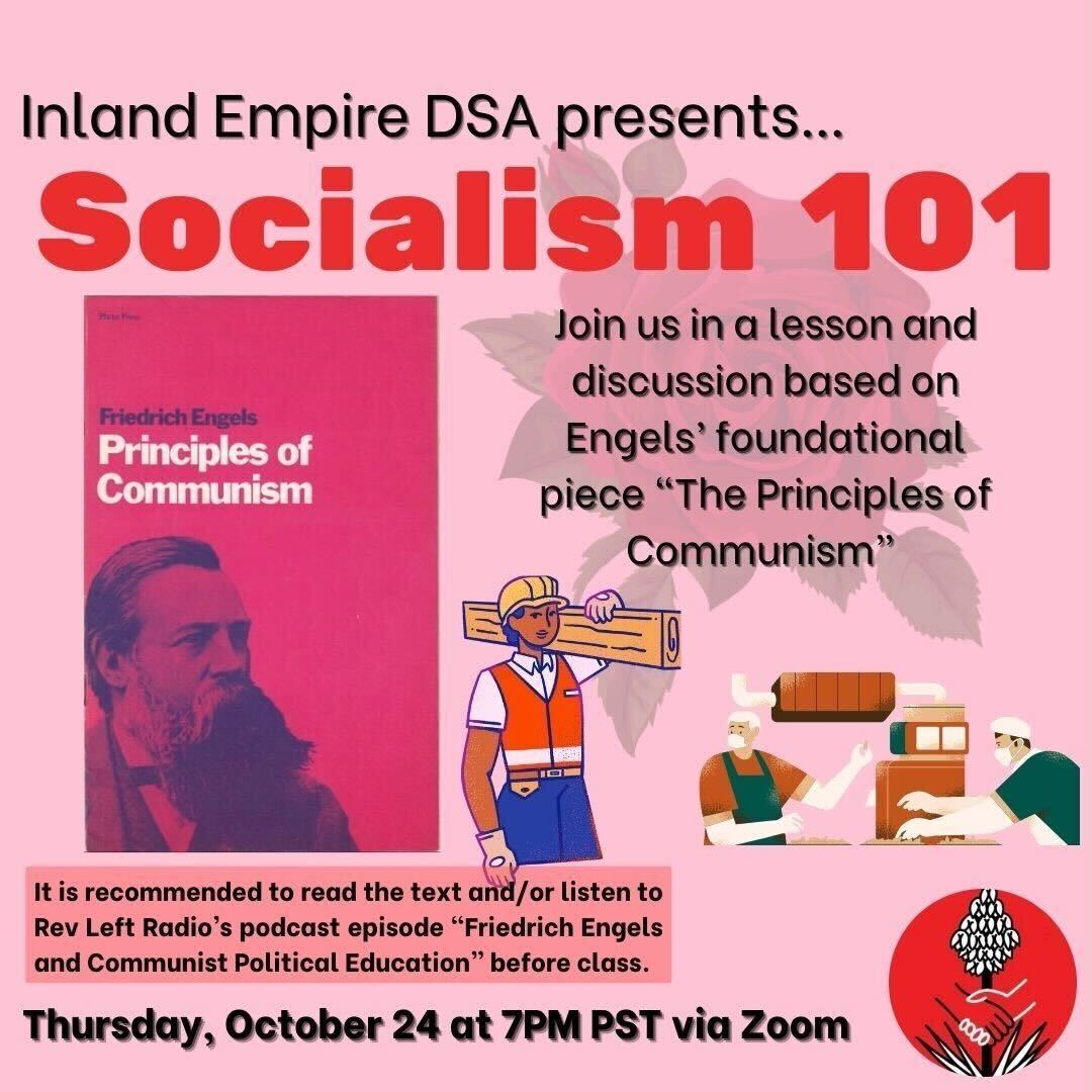 Join us October 24th at 7pm on Zoom for our next Socialism 101! Prior to the event, comrades are encouraged to either read "The Principles of Communism" by Friedrich Engels or listen to RevLeft Radio's podcast episode titled "Friedrich Engels and Communist Political Education."