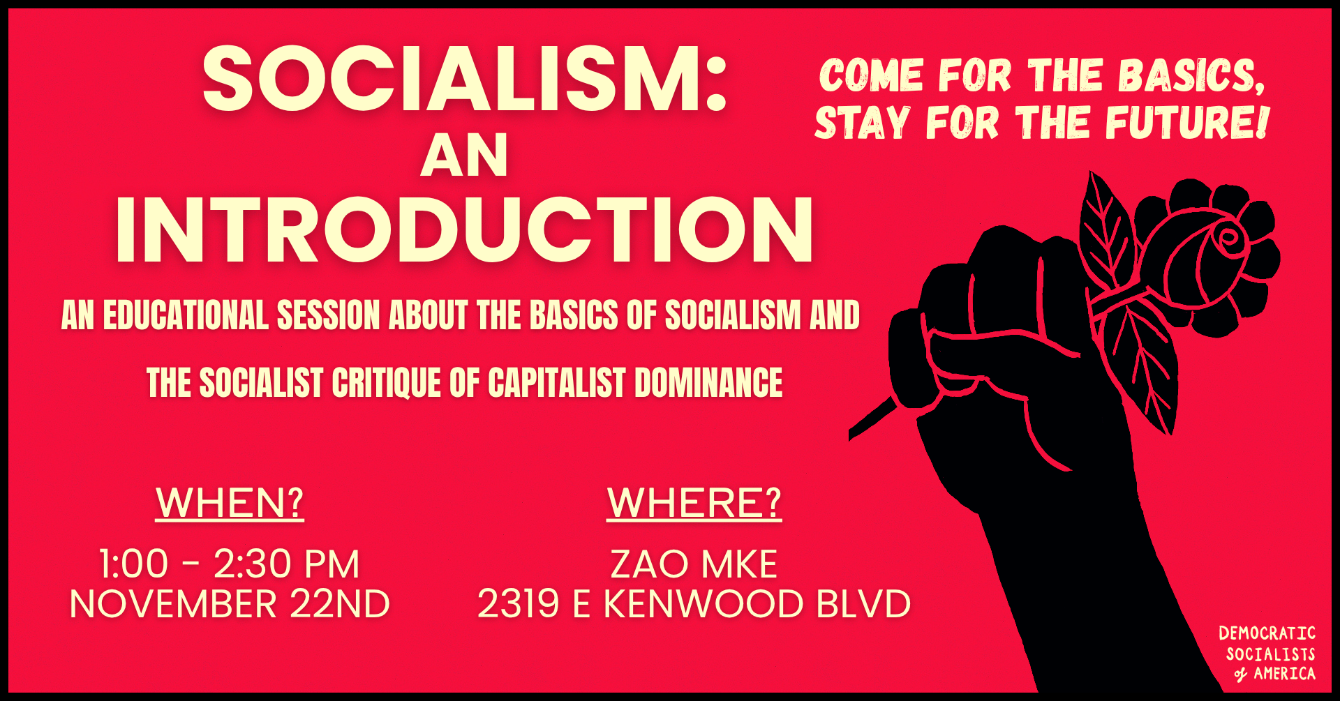 Join us for the "Socialism: An Introduction" educational event to learn the fundamentals of socialist thought and its critiques of capitalist dominance. This is a great learning opportunity for anyone wanting to start exploring socialist theory or brush up on the basics.