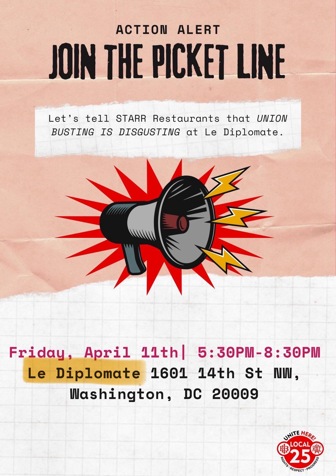 UNITE HERE Local 25 is holding informational pickets outside of Le Diplomate to tell people about STARR’s union busting tactics!