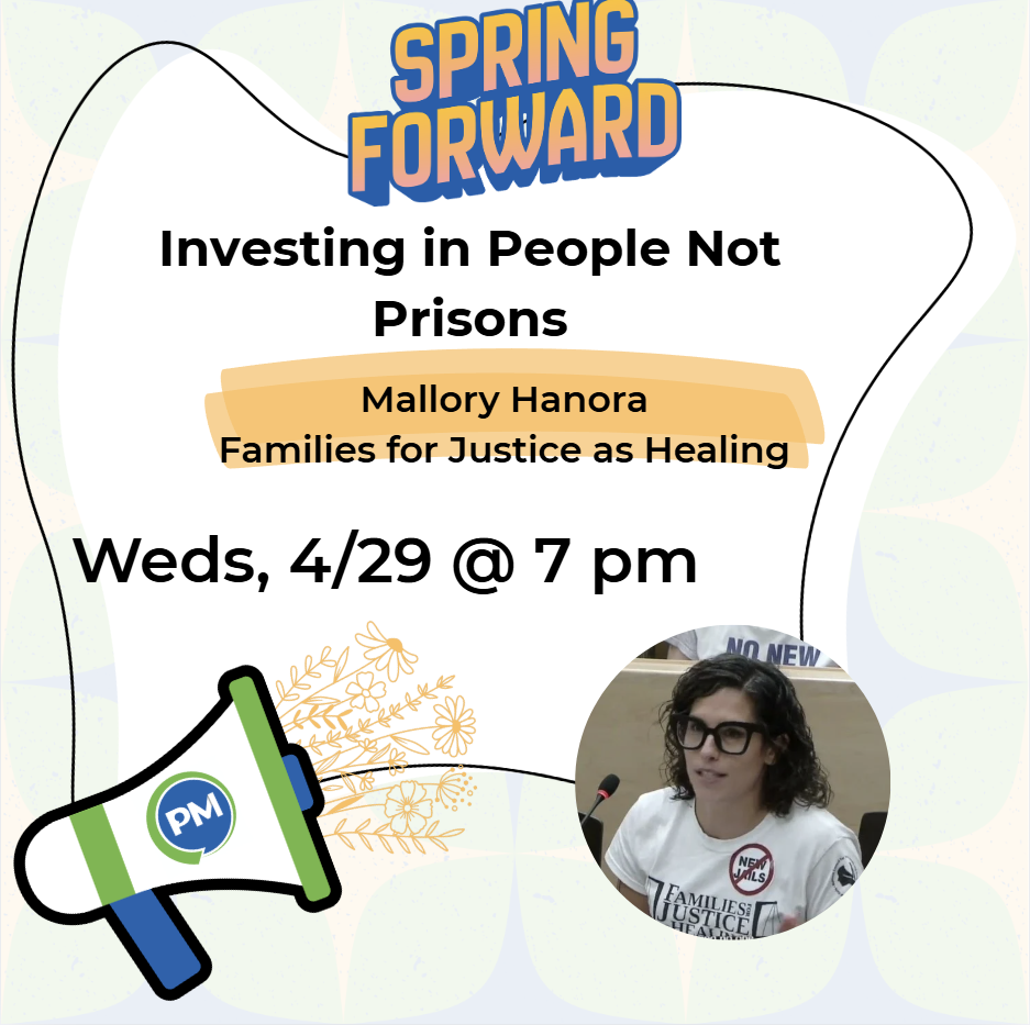 Mallory Hanora from Families for Justice as Healing will join us to explain the campaign against the prison project as well as how we can advocate for policies that center community safety and well-being instead.