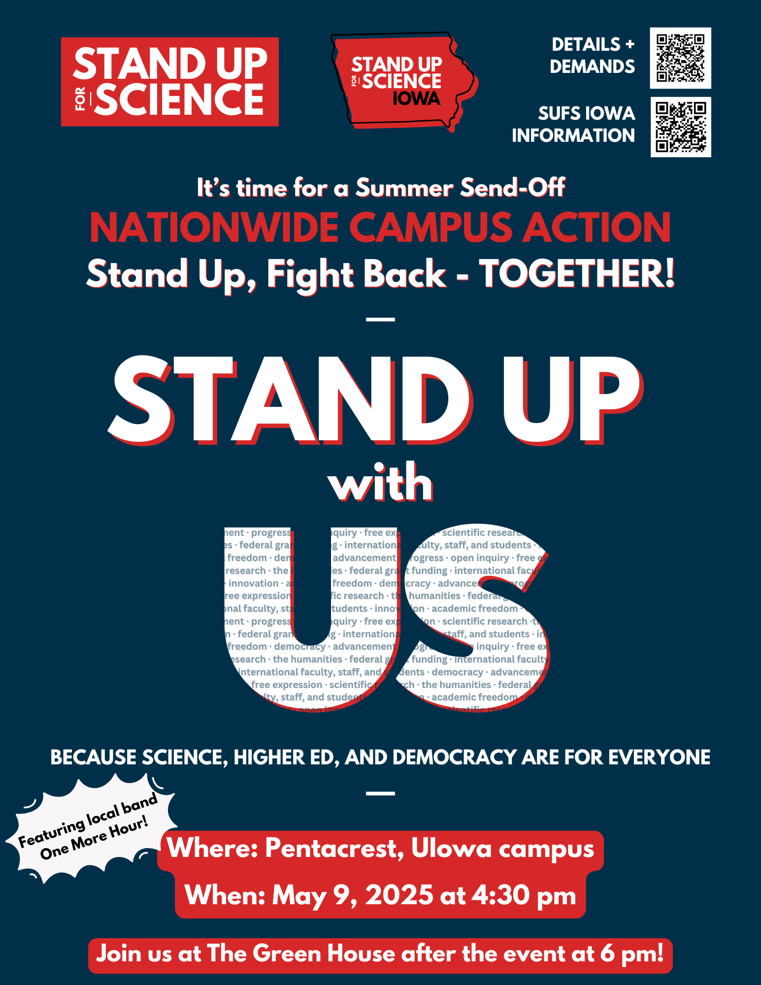 Join us at The Pentacrest on Friday, May 9th at 4:30 PM to ask The University of Iowa leadership to stand up with us--their faculty, staff, and students--in defense of academic freedom, open inquiry, and free expression.