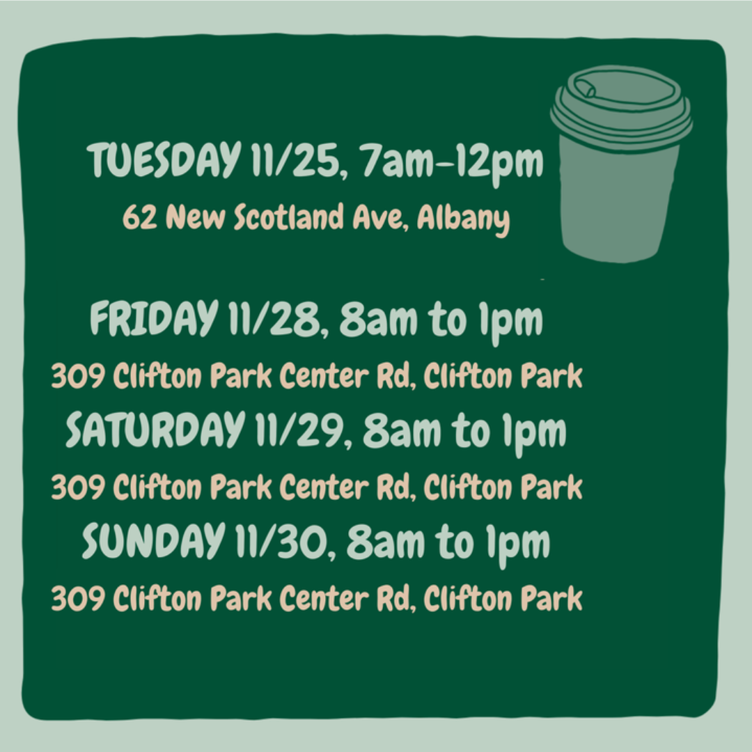 - Tues: 11/25 - 62 New Scotland Avenue Albany NY, 7am-12pm