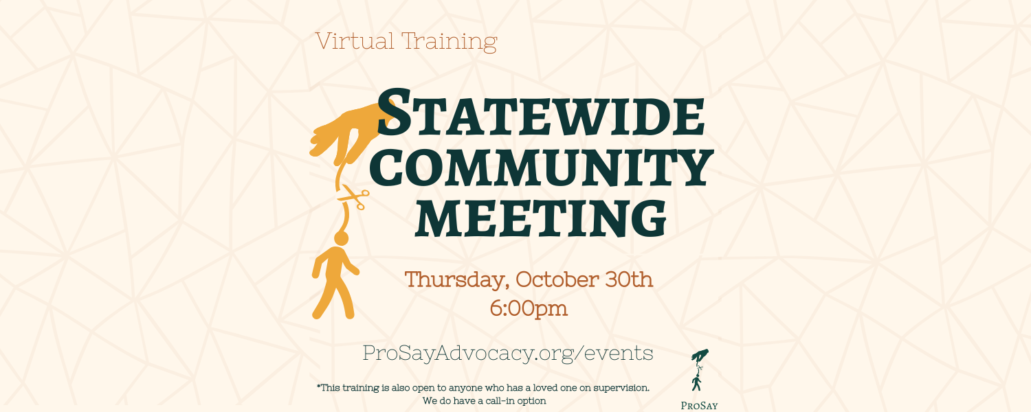 Join us for our Monthly Statewide Community Meeting! We will have a discussion on what is going on in the state, upcoming events, and how people on supervision can impact changes to create thriving lives and communities!