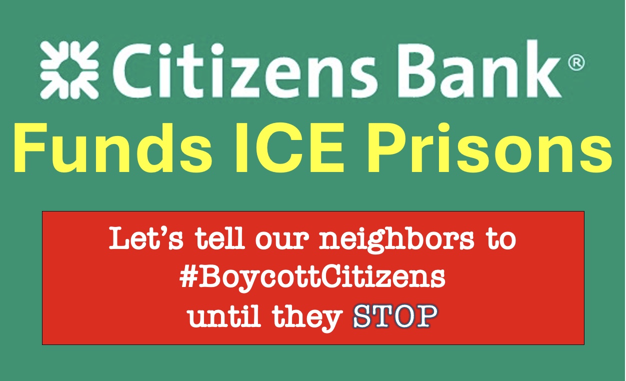 Please only bring signs specific to this action: Cages Aren't Communities; Citizens Bank - Stop Financing ICE gulags; Citizens Bank + ICE = Human Rights Abuse; ICE Prisons Don't Strengthen Our Communities; Citizens Bank- Cut Ties With ICE Gulags; etc. We'll have some extras too.