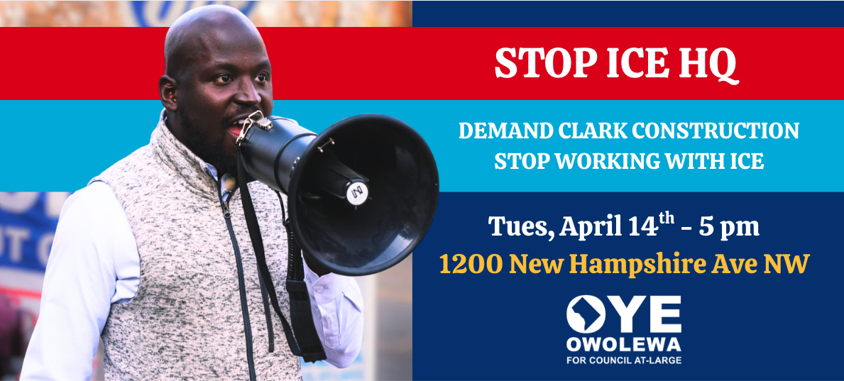 Oye Owolewa and a coalition of community organizations, advocates, and residents will protest outside Clark Construction’s DC office on Tuesday, April 14, from 5:00 PM to 6:30 PM at 1200 New Hampshire Ave NW, Suite 510. The coalition’s demands are clear: Clark Construction must immediately withdraw from any ICE-related projects in Washington, DC.