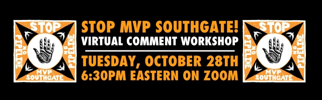 Join us on Zoom Tuesday October 28th at 6:30pm to learn how you can tell the FERC to deny MVP’s amendment request! We will be talking about why this is important and let you know how you can submit your comment and make your voices heard. We will also let you know how to submit comments to the Virginia Department of Environmental Quality to stop Williams Co Southeast Supply Enhancement Project (SSEP). We hope to see you there!