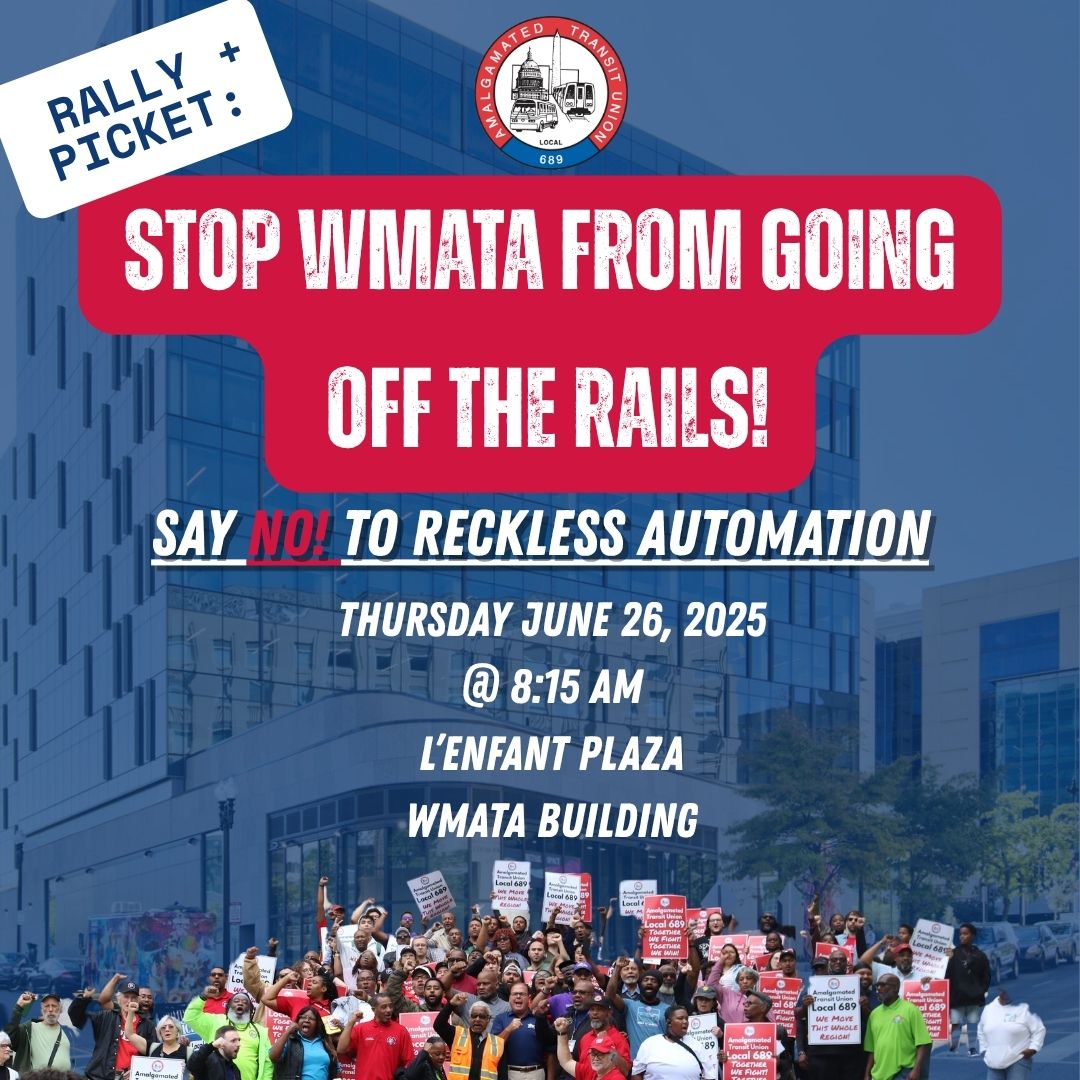 WMATA is recklessly pushing ahead with an automation policy that puts workers and riders alike at risk. If Metro management has its way, it will remove Station Managers from stations and operators from trains. We cannot allow for this dangerous idea to come to pass and derail the DMV. Join Local 689 for a picket and rally in front of WMATA HQ while the Board of Directors meets inside!