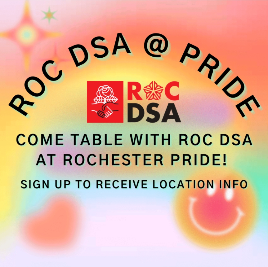 We'll be tabling near the Rochester Pride Festival to talk with people about socialism and queer liberation. No one's free until we're all free!
