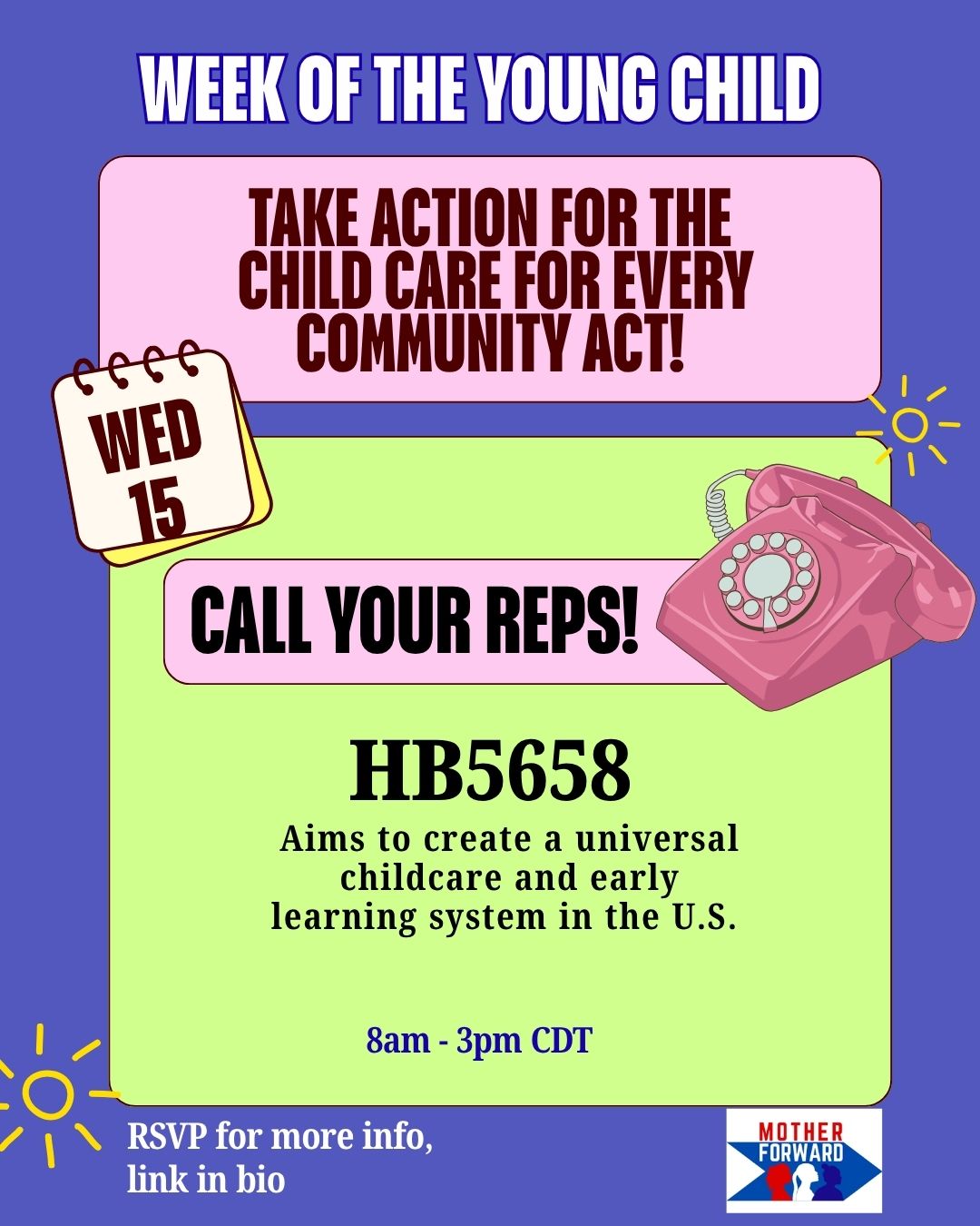 “Hi, my name is [Your Name] and I’m a constituent from [Your City, State]. I’m a member of Mother Forward and I’m asking [Senator/Representative Last Name] to co-sponsor H.R.5658, the Child Care for Every Community Act. Moms on both sides of the aisle are feeling the struggle to afford childcare. This is not a red or blue issue. It is a family issue. Please co-sponsor this bill and help move it forward. Thank you for your time.”