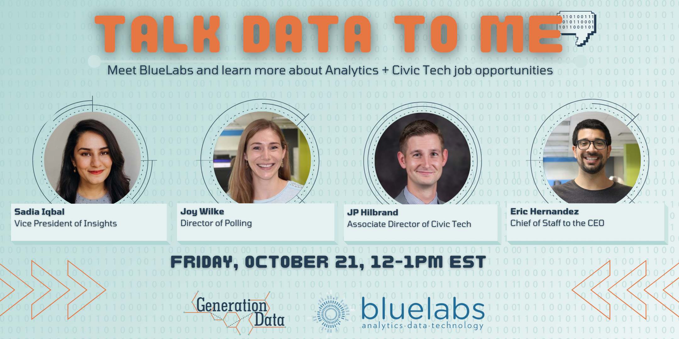We're excited to be joined by Sadia Iqbal (Vice President of Insights), Joy Wilke (Director of Polling), JP Hilbrand (Associate Director of Civic Tech), and Eric Hernandez (Chief of Staff to the CEO). You can read more about Sadia, Joy, JP, Eric and their BlueLabs colleagues here.