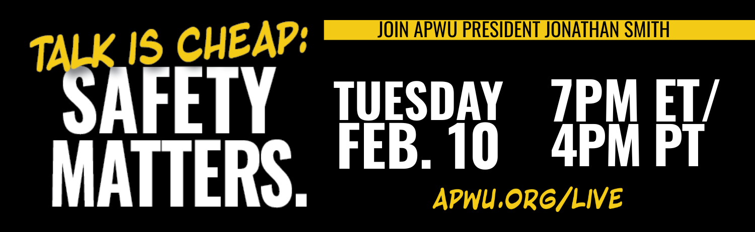 APWU President Jonathan Smith will hold his first livestream events at 7 p.m. on Tuesday, Feb. 10. The hour-long livestream will address the safety challenges postal workers face every day and how APWU is ready to hold management accountable to our right to a safe and healthy workplace.