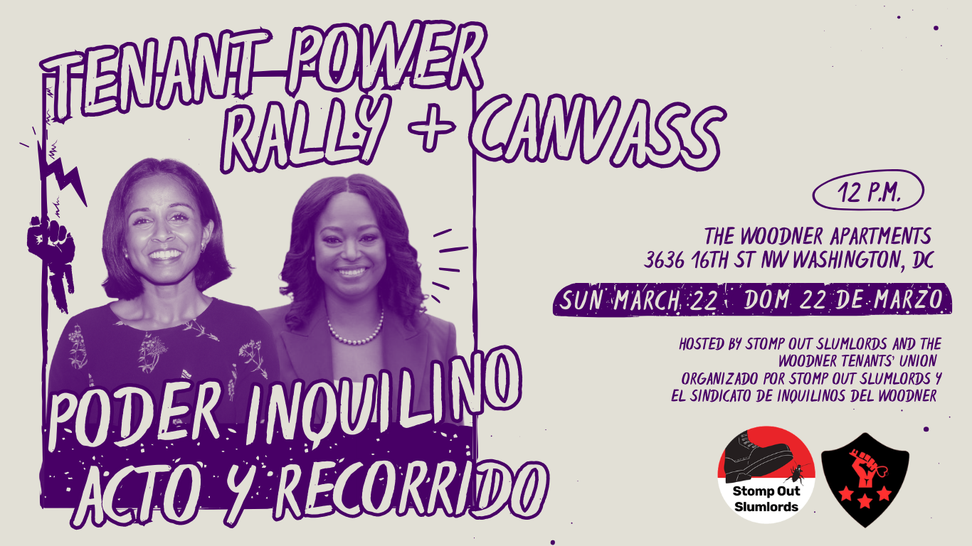 Join Stomp Out Slumlords and The Woodner Tenants' Union for a meet and greet with Aparna Raj, candidate for Ward 1 Council, and Janeese Lewis George, Ward 4 Councilmember and Mayoral Candidate. Aparna Raj is a Stomp Out Slumlords organizer who fought with tenants against a major slumlord in Ward 8, resulting in a $41 million settlement for the tenants. Janeese Lewis George is a longtime fighter for tenant rights, who has used her position on Council to stand with tenants organizing for better conditions and to fight back against the RENTAL Act. We will hear from the candidates about their plans to create safe, dignified housing in DC, protect and expand tenant rights, and support tenant organizing efforts. Come out to meet these candidates and get your questions answered!