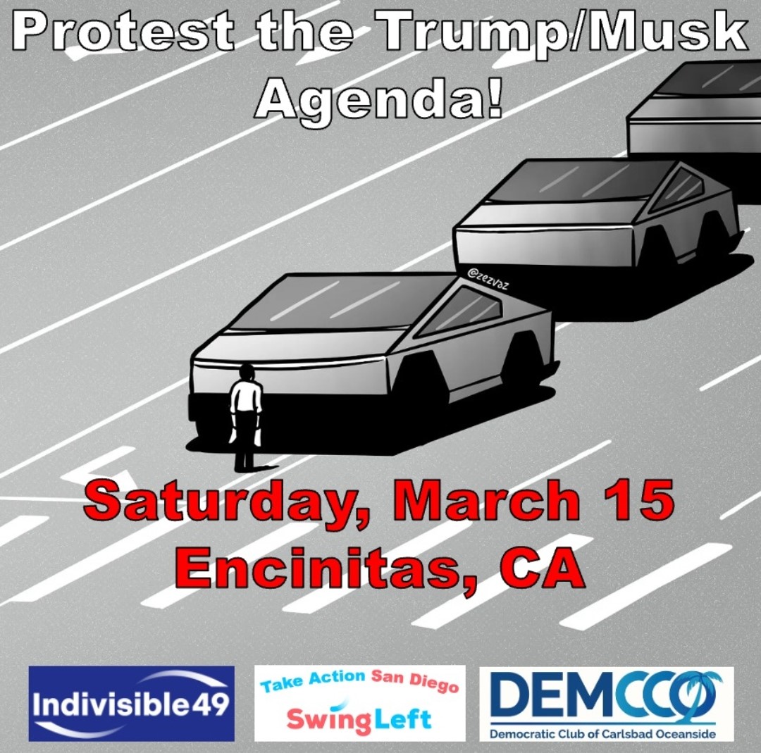 Rally peacefully to bring attention to the danger that the Trump/Musk agenda poses. Encinitas Tesla dealership, 1302 Encinitas Blvd.