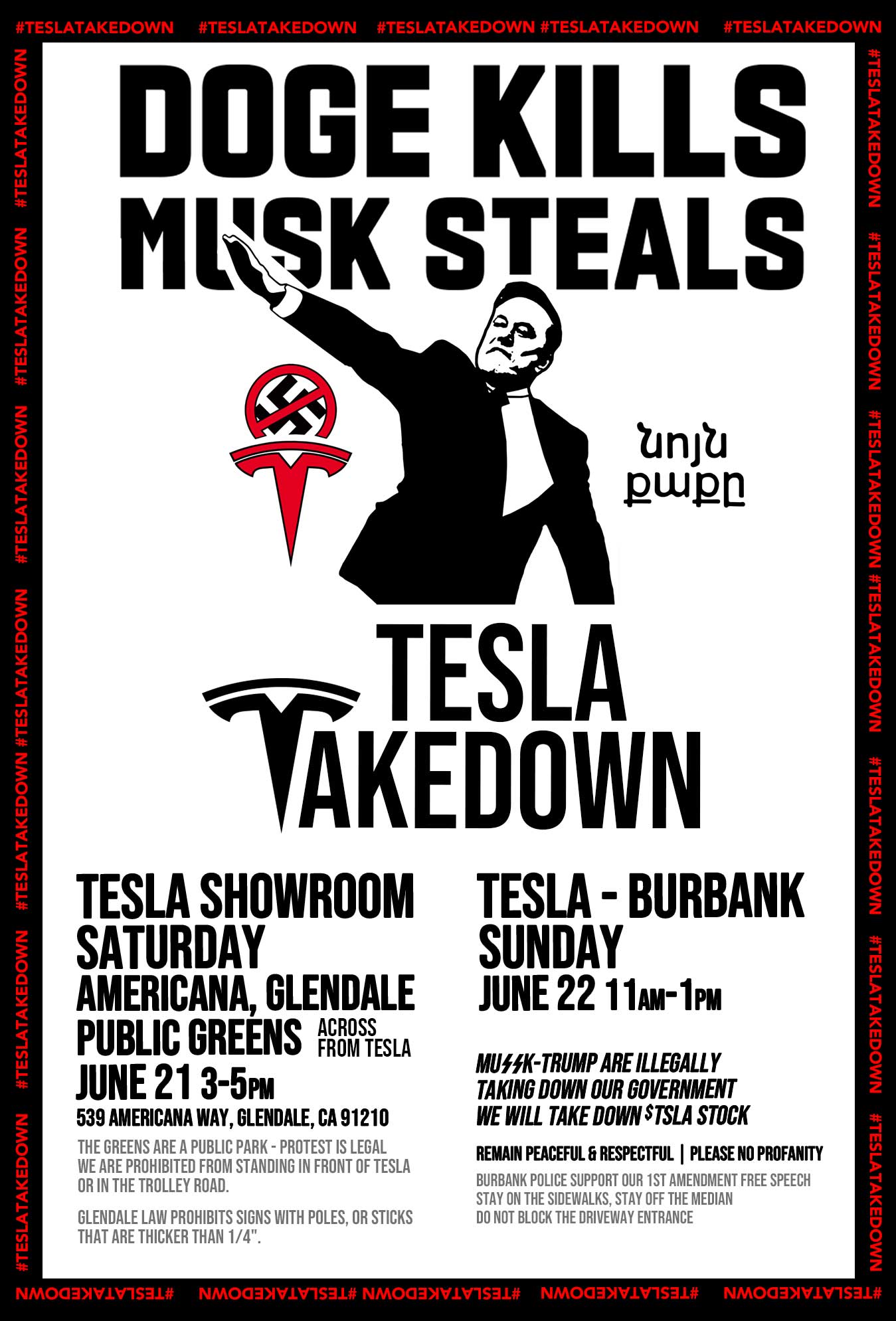 Tesla Takedown is a peaceful protest movement. We oppose violence, vandalism and destruction of property. This protest is a lawful exercise of our First Amendment right to peaceful assembly.