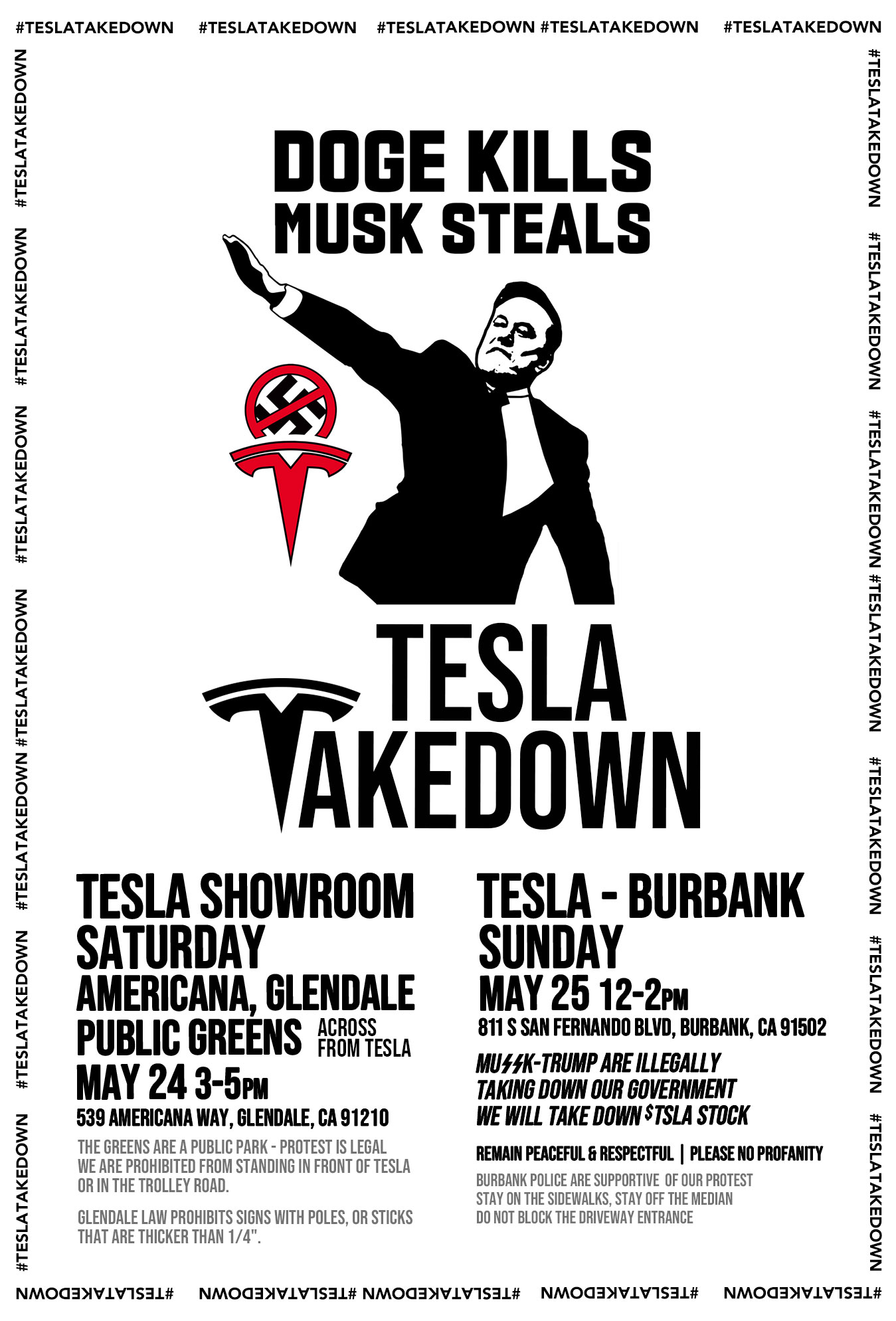 Tesla Takedown is a peaceful protest movement. We oppose violence, vandalism and destruction of property. This protest is a lawful exercise of our First Amendment right to peaceful assembly.
