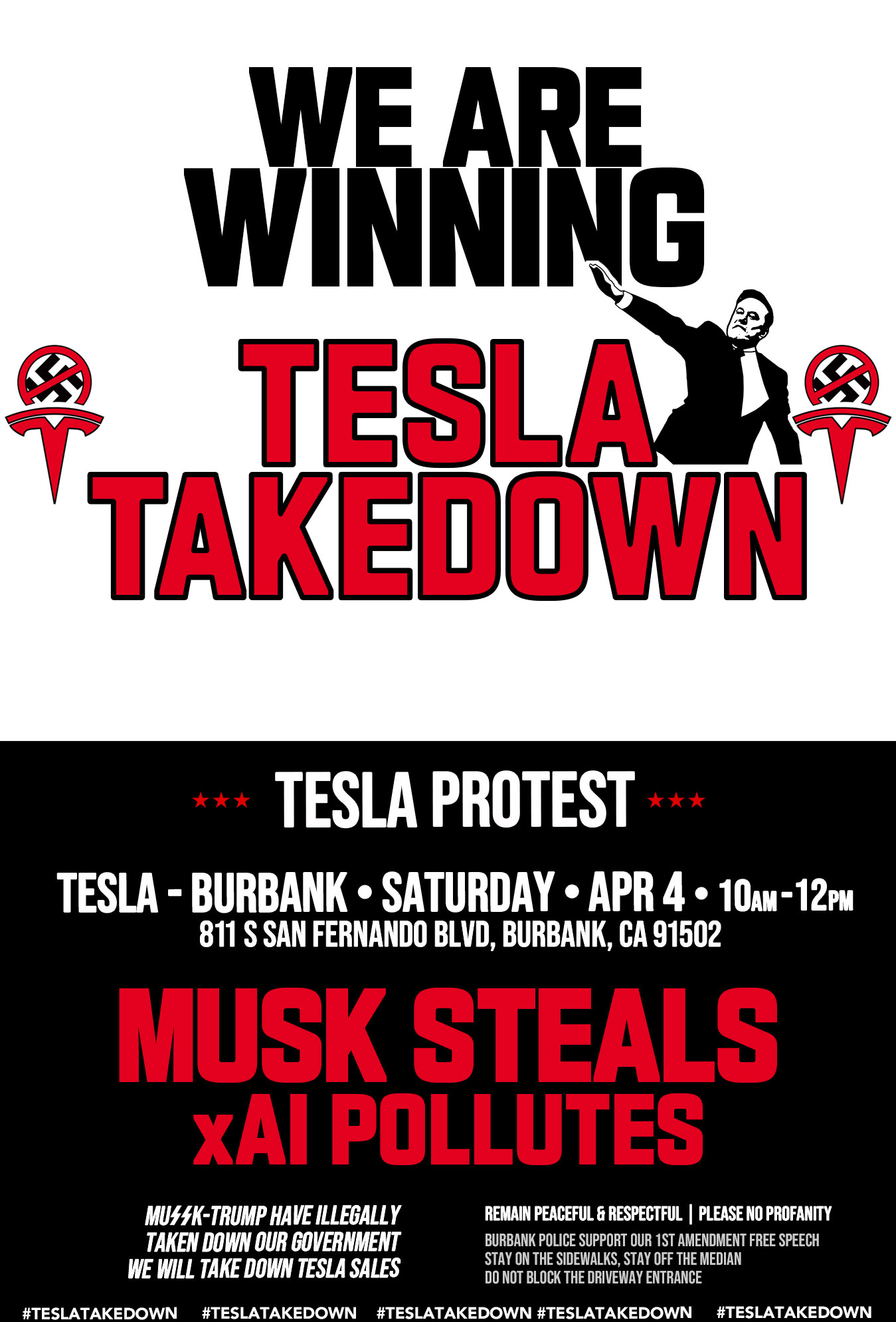 Tesla Takedown is a peaceful protest movement. We oppose violence, vandalism and destruction of property. This protest is a lawful exercise of our First Amendment right to peaceful assembly.