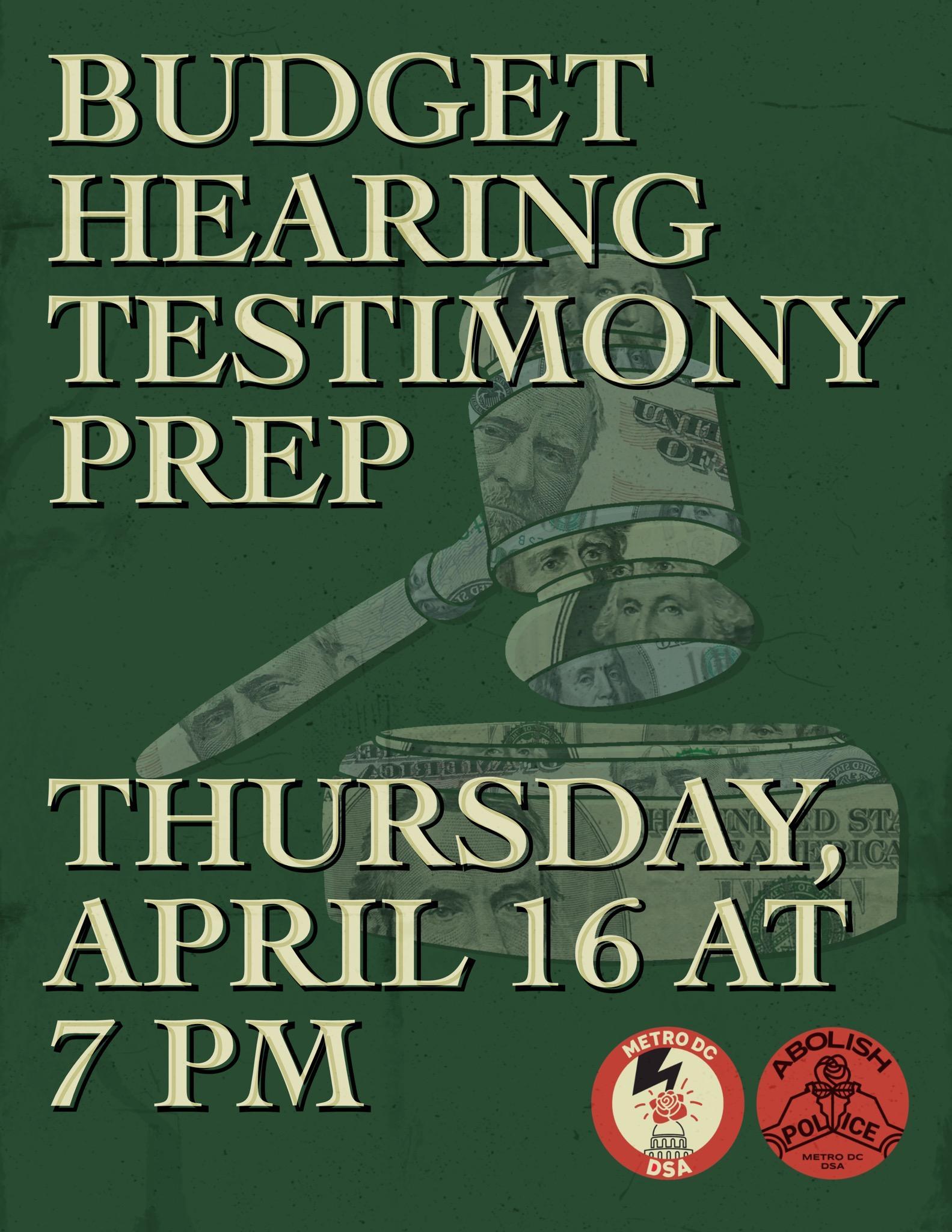 Join MDC DSA's Abolition Working Group to learn how the DC budget happens, and why testifying at DC Council's budget oversight hearings is important. Participants will also brainstorm what should be included in their testimonies for budget oversight hearings, and have dedicated time for writing and feedback.