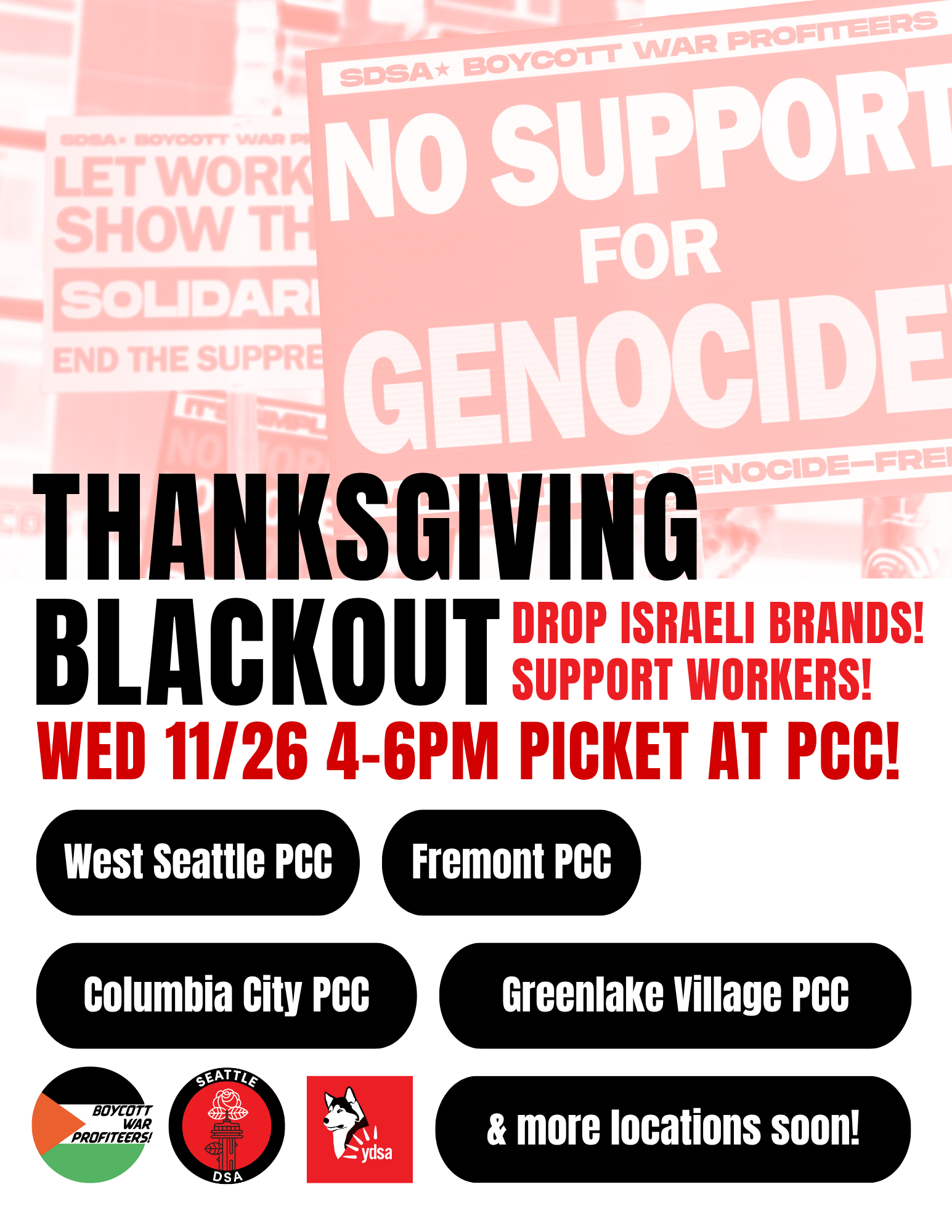 No profits for PCC as long as they support genocide and apartheid! Boycott War Profiteers is back with a coalition of orgs for a Thanksgiving Blackout picket on Wednesday, November 26th from 4-6pm. Join us at one of these locations and disrupt one of the most profitable shopping days of the year for PCC: