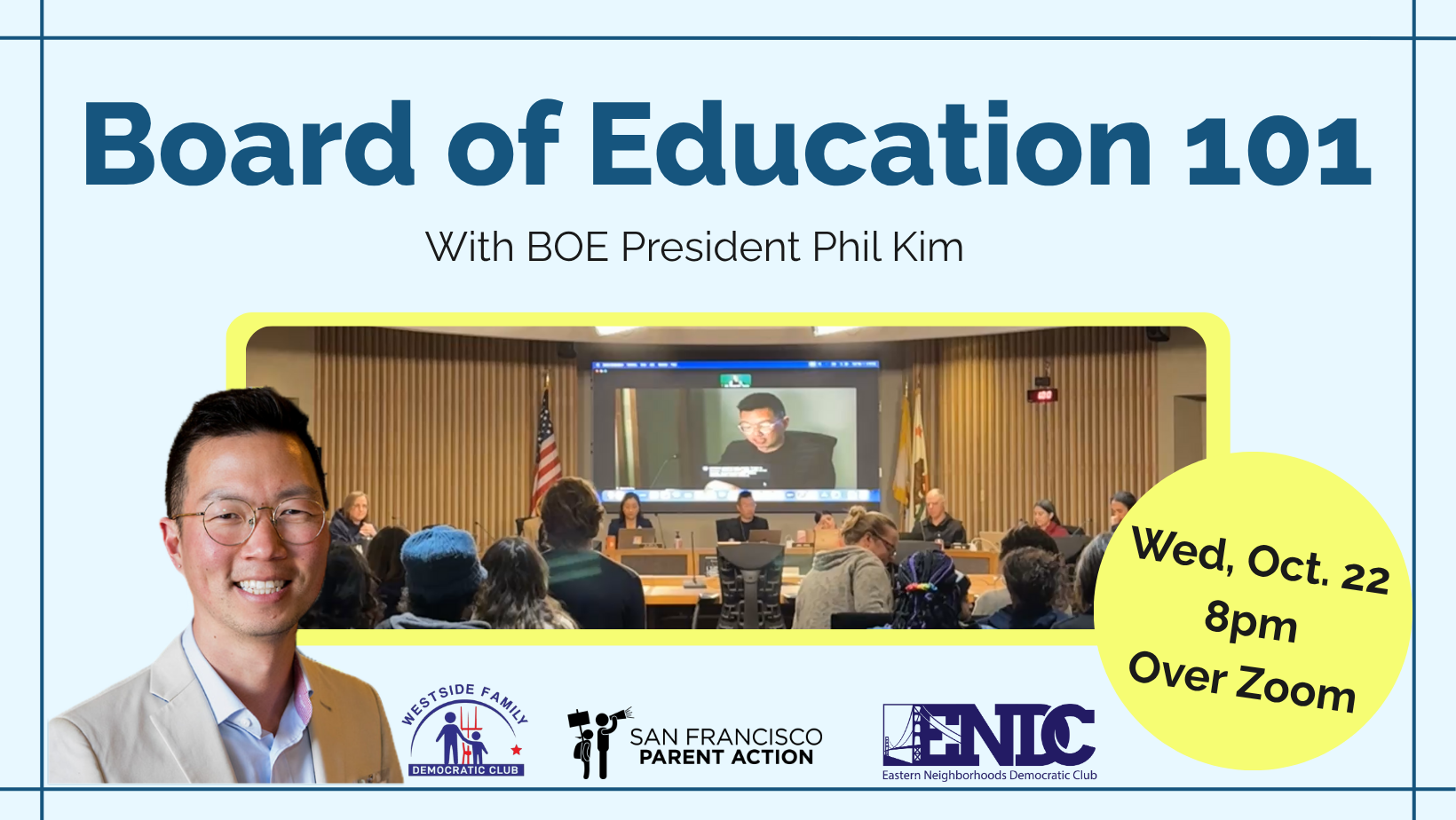 Join us on Wednesday, October 22 at 8 pm on Zoom for BOE 101. Whether you’ve been following the board for years or are just starting to pay attention, this session will help you understand the role and purpose of our local school board, and why it matters for SFUSD’s 49,000 public school students. We’ll also hear directly from Board President Phil Kim, who will join us for a Q&A.
