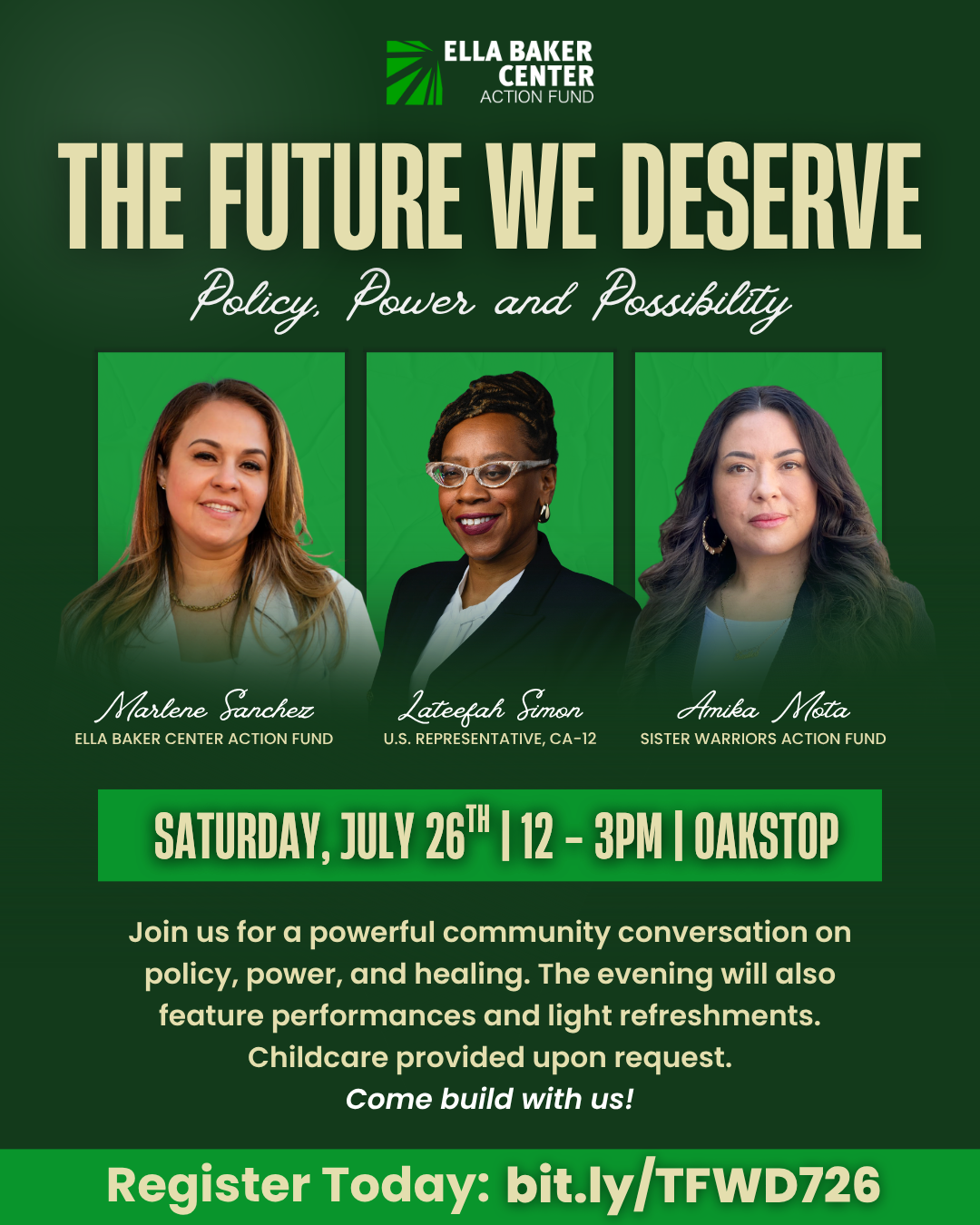 Join us for a community conversation, The Future We Deserve: Policy, Power and Possibility, with speakers Congresswoman Lateefah Simon, Ella Baker Center Action Fund Executive Director Marlene Sanchez, and Sister Warriors Action Fund Executive Director Amika Mota