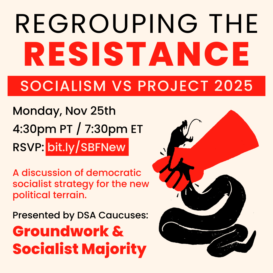 Trump is preparing to consolidate power with his authoritarian Project 2025. How can we unite, organize, and fight back against the incoming MAGA administration? Join Groundwork and Socialist Majority caucuses as we discuss ideas for democratic socialist strategy and tactics in the new political terrain.