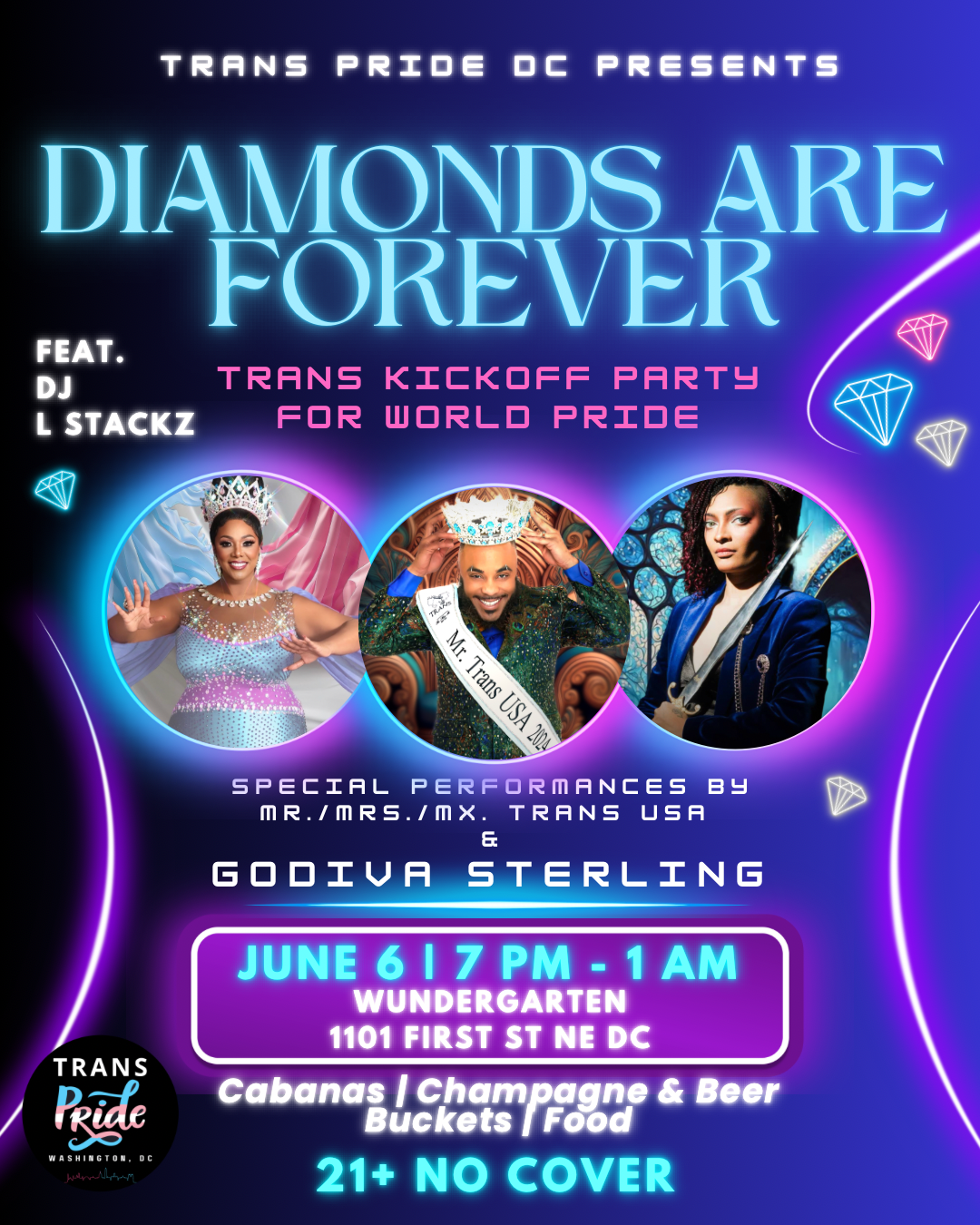Feel the sparkle, the power, and the pride at Diamonds Are Forever – Trans Pride DC’s official kickoff to the 2025 Pride season. Hosted at the electric Wunder Garten DC, this night brings together music, performance, and unapologetic trans joy under the stars.
