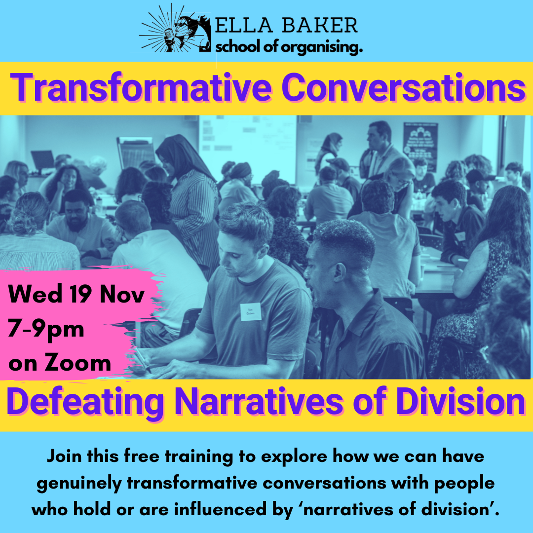 Sign up on this page to get the Zoom link, and join us on Wednesday 19th November, 7-9pm for this interactive workshop on holding transformative conversations to defeat narratives of division.