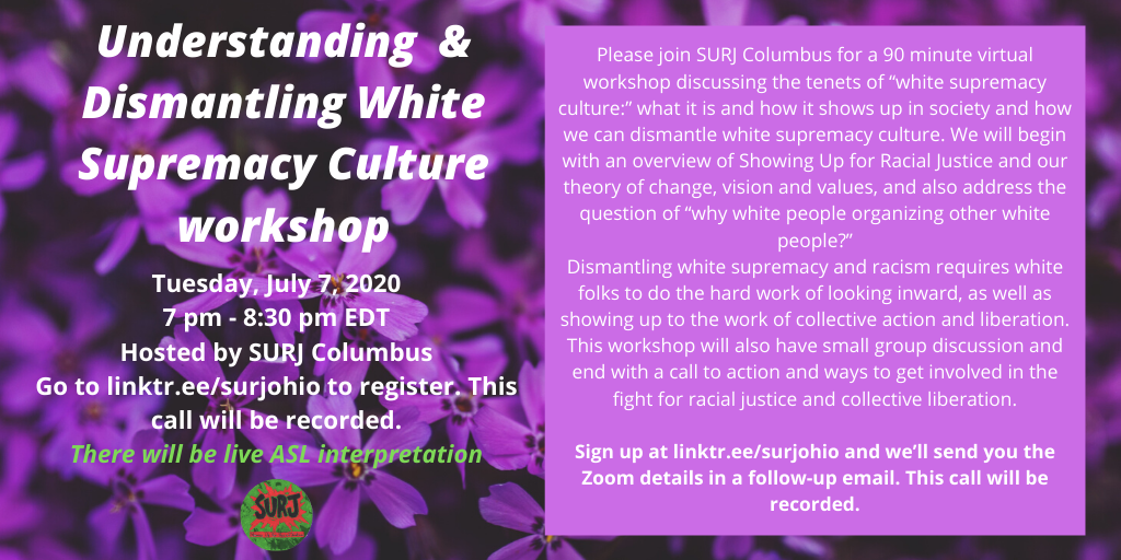 Please join SURJ Columbus for a 90 minute virtual workshop, July 7, 7-8:30pm EDT, discussing the tenets of “white supremacy culture:” what it is and how it shows up in society and how we can dismantle white supremacy culture. We will begin with an overview of Showing Up for Racial Justice and our theory of change, vision and values, and also address the question of “why white people organizing other white people?” There will be live ASL interpretation. (Please mark yes on the RSVP form if you need this)