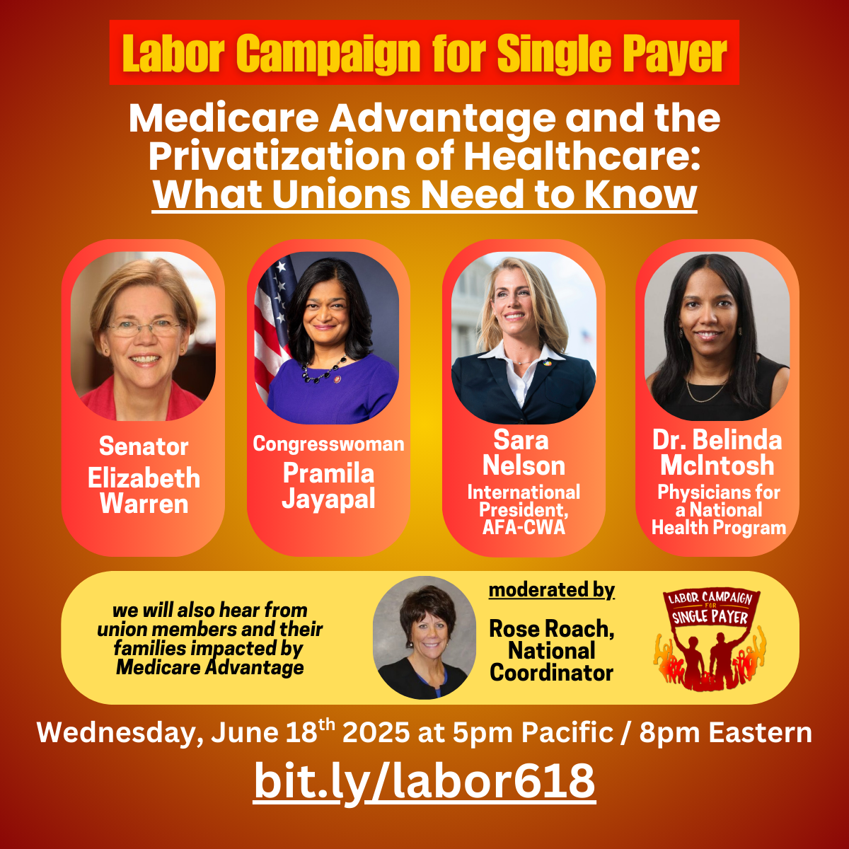 On Wednesday, June 18th at 5pm Pacific / 8pm Eastern, we at the Labor Campaign for Single Payer will host a webinar to educate and mobilize union workers in the fight to #ReclaimMedicare from corporate greed. The event will feature remarks from: