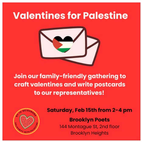 Let’s gather, create, and take action together! Join the NY-10 community for a family-friendly drop in event. We’ll write postcards to our federal representatives to demand an arms embargo and there will be a craft table where children (and the young at heart) can make valentines for Palestine.