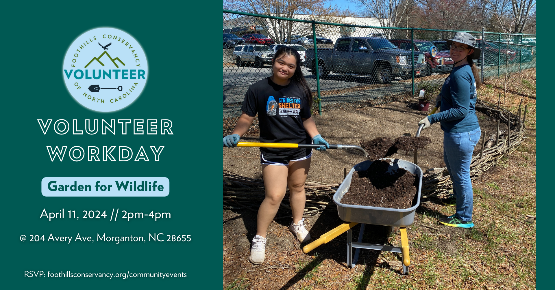 Project Description: Students from the NC School of Science and Math have been transforming Foothills Conservancy's office space into a wildlife habitat for the last year! Come help them put the finishing touches on our gardens so we can officially certify our yard as a Wildlife Habitat through the National Wildlife Federation.